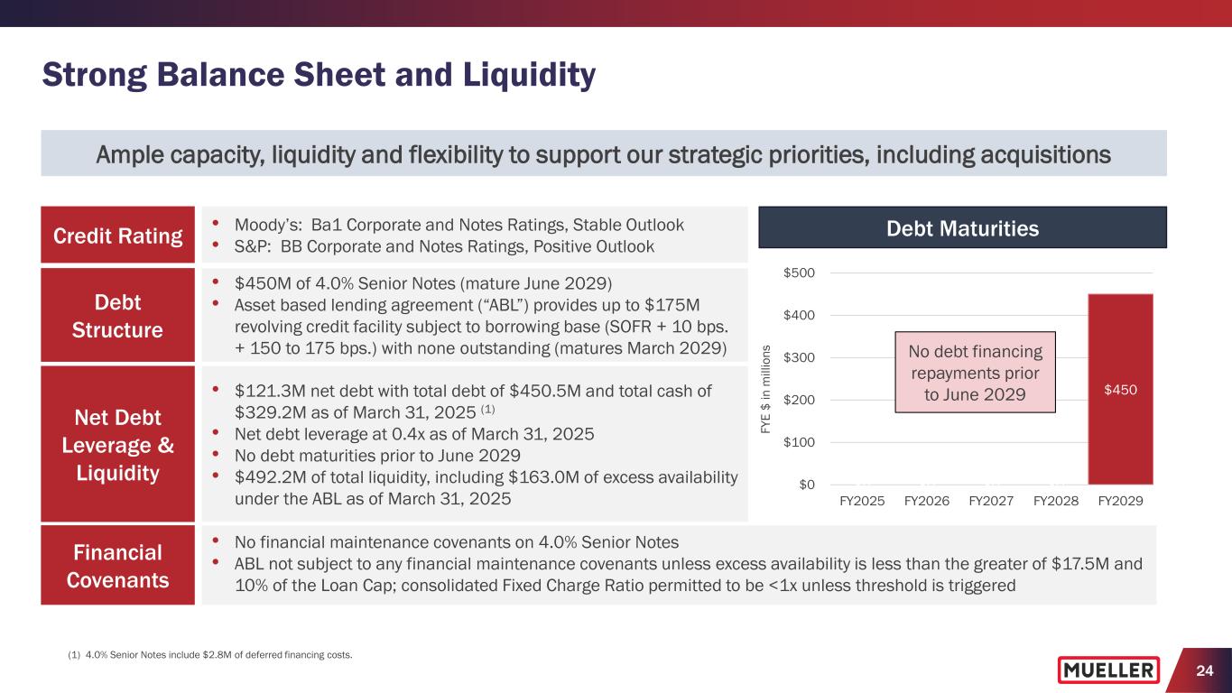 23 Free Cash Flow (YTD Q2 FY2025) • Increased net cash provided by operating activities by $6.2M to $68.4M for six-month period compared with prior year − Increase primarily driven by higher net income partially offset by changes in working capital, including decreases in other current liabilities such as incentive compensation • Invested $21.1M in capital expenditures through first six months ended Q2 compared with $15.8M in the prior year period − Increase was primarily driven by increased expenditures in our foundries • Generated $47.3M of free cash flow compared with $46.4M in prior year − Achieved 51% free cash flow as % of adjusted net income, which was in line with expectations (1) See Appendix for reconciliation of non-GAAP measures to their corresponding GAAP measures. ($20.5) ($15.8) ($21.1) ($22.2) $62.2 $68.4 ($42.7) $46.4 $47.3 YTD Q2 FY2023 YTD Q2 FY2024 YTD Q2 FY2025 $ in M ill io ns Cash provided by (used in) operating activities Capital expenditures Free cash flow