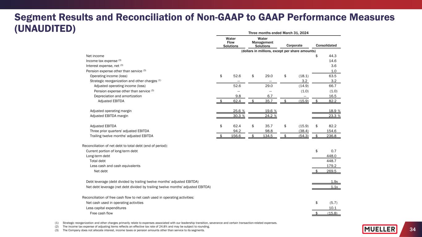 33 Segment Results and Reconciliation of Non-GAAP to GAAP Performance Measures (UNAUDITED) (1) Strategic reorganization and other charges primarily relate to expenses associated with our leadership transition, severance and certain transaction-related expenses. (2) The income tax expense of adjusting items reflects an effective tax rate of 24.8% and may be subject to rounding. Three months ended March 31, 2024 Water Flow Solutions Water Management Solutions Corporate Consolidated (dollars in millions, except per share amounts) Net sales $ 205.8 $ 147.6 $ — $ 353.4 Gross profit $ 77.2 $ 53.2 $ — $ 130.4 Selling, general and administrative expenses 24.6 24.2 14.9 63.7 Strategic reorganization and other charges (1) — — 3.2 3.2 Operating income (loss) $ 52.6 $ 29.0 $ (18.1) $ 63.5 Operating margin 25.6 % 19.6 % 18.0 % Capital expenditures $ 6.0 $ 4.1 $ — $ 10.1 Net income $ 44.3 Net income margin 12.5 % Reconciliation of non-GAAP to GAAP performance measures: Net income $ 44.3 Strategic reorganization and other charges (1) 3.2 Income tax expense of adjusting items (2) (1.2) Adjusted net income $ 46.3 Weighted average diluted shares outstanding 156.7 Net income per diluted share $ 0.28 Strategic reorganization and other charges per diluted share (1) 0.02 Income tax expense of adjusting items per diluted share (2) — Adjusted net income per diluted share $ 0.30