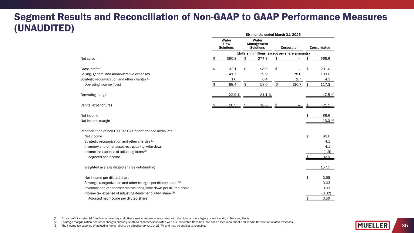 35 Segment Results and Reconciliation of Non-GAAP to GAAP Performance Measures (UNAUDITED) (1) Gross profit includes $4.1 million in Inventory and other asset write-downs associated with the closure of our legacy brass foundry in Decatur, Illinois. (2) Strategic reorganization and other charges primarily relate to expenses associated with our leadership transition, non-cash asset impairment and certain transaction-related expenses. (3) The income tax expense of adjusting items reflects an effective tax rate of 23.7% and may be subject to rounding. Six months ended March 31, 2025 Water Flow Solutions Water Management Solutions Corporate Consolidated (dollars in millions, except per share amounts) Net sales $ 390.8 $ 277.8 $ — $ 668.6 Gross profit (1) $ 132.1 $ 98.9 $ — $ 231.0 Selling, general and administrative expenses 41.7 39.9 28.0 109.6 Strategic reorganization and other charges (2) 1.0 0.4 2.7 4.1 Operating income (loss) $ 89.4 $ 58.6 $ (30.7) $ 117.3 Operating margin 22.9 % 21.1 % 17.5 % Capital expenditures $ 10.5 $ 10.6 $ — $ 21.1 Net income $ 86.6 Net income margin 13.0 % Reconciliation of non-GAAP to GAAP performance measures: Net income $ 86.6 Strategic reorganization and other charges (2) 4.1 Inventory and other asset restructuring write-down 4.1 Income tax expense of adjusting items (3) (1.9) Adjusted net income $ 92.9 Weighted average diluted shares outstanding 157.5 Net income per diluted share $ 0.55 Strategic reorganization and other charges per diluted share (2) 0.03 Inventory and other asset restructuring write-down per diluted share 0.03 Income tax expense of adjusting items per diluted share (3) (0.02) Adjusted net income per diluted share $ 0.59