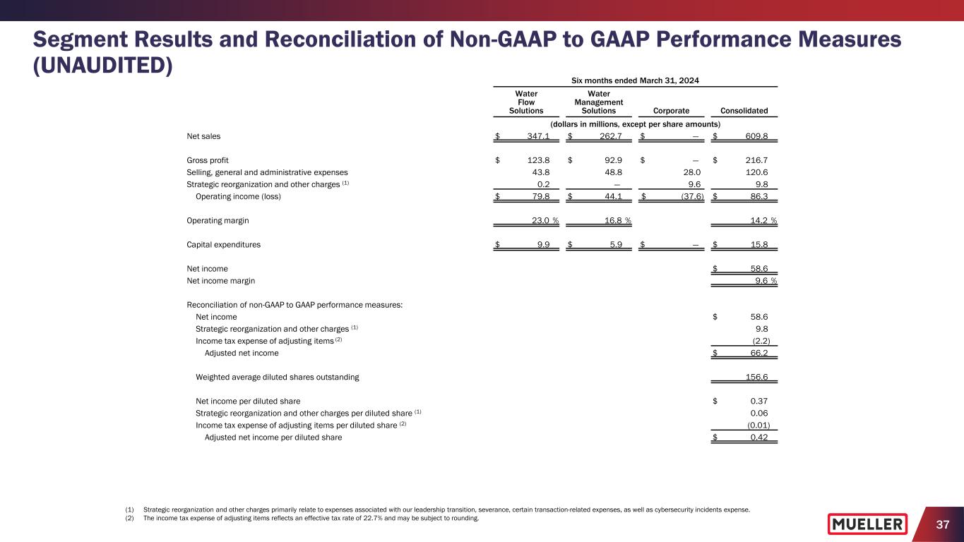 36 Segment Results and Reconciliation of Non-GAAP to GAAP Performance Measures (UNAUDITED) Six months ended March 31, 2025 Water Flow Solutions Water Management Solutions Corporate Consolidated (dollars in millions, except per share amounts) Net income $ 86.6 Income tax expense (4) 26.9 Interest expense, net (4) 3.9 Pension benefit other than service (4) (0.1) Operating income (loss) $ 89.4 $ 58.6 $ (30.7) 117.3 Strategic reorganization and other charges (2) 1.0 0.4 2.7 4.1 Inventory and other asset restructuring write-down 4.1 — — 4.1 Adjusted operating income (loss) 94.5 59.0 (28.0) 125.5 Pension benefit other than service (4) — — 0.1 0.1 Depreciation and amortization 12.4 10.0 — 22.4 Adjusted EBITDA $ 106.9 $ 69.0 $ (27.9) $ 148.0 Adjusted operating margin 24.2 % 21.2 % 18.8 % Adjusted EBITDA margin 27.4 % 24.8 % 22.1 % Reconciliation of free cash flow to net cash provided by operating activities: Net cash provided by operating activities $ 68.4 Less capital expenditures 21.1 Free cash flow $ 47.3 (1) Gross profit includes $4.1 million in Inventory and other asset write-downs associated with the closure of our legacy brass foundry in Decatur, Illinois. (2) Strategic reorganization and other charges primarily relate to expenses associated with our leadership transition, non-cash asset impairment and certain transaction-related expenses. (3) The income tax expense of adjusting items reflects an effective tax rate of 23.7% and may be subject to rounding. (4) The Company does not allocate interest, income taxes or pension amounts other than service to its segments.