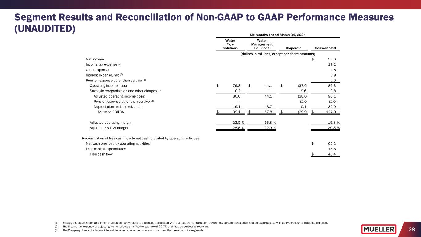 37 Segment Results and Reconciliation of Non-GAAP to GAAP Performance Measures (UNAUDITED) (1) Strategic reorganization and other charges primarily relate to expenses associated with our leadership transition, severance, certain transaction-related expenses, as well as cybersecurity incidents expense. (2) The income tax expense of adjusting items reflects an effective tax rate of 22.7% and may be subject to rounding. Six months ended March 31, 2024 Water Flow Solutions Water Management Solutions Corporate Consolidated (dollars in millions, except per share amounts) Net sales $ 347.1 $ 262.7 $ — $ 609.8 Gross profit $ 123.8 $ 92.9 $ — $ 216.7 Selling, general and administrative expenses 43.8 48.8 28.0 120.6 Strategic reorganization and other charges (1) 0.2 — 9.6 9.8 Operating income (loss) $ 79.8 $ 44.1 $ (37.6) $ 86.3 Operating margin 23.0 % 16.8 % 14.2 % Capital expenditures $ 9.9 $ 5.9 $ — $ 15.8 Net income $ 58.6 Net income margin 9.6 % Reconciliation of non-GAAP to GAAP performance measures: Net income $ 58.6 Strategic reorganization and other charges (1) 9.8 Income tax expense of adjusting items (2) (2.2) Adjusted net income $ 66.2 Weighted average diluted shares outstanding 156.6 Net income per diluted share $ 0.37 Strategic reorganization and other charges per diluted share (1) 0.06 Income tax expense of adjusting items per diluted share (2) (0.01) Adjusted net income per diluted share $ 0.42
