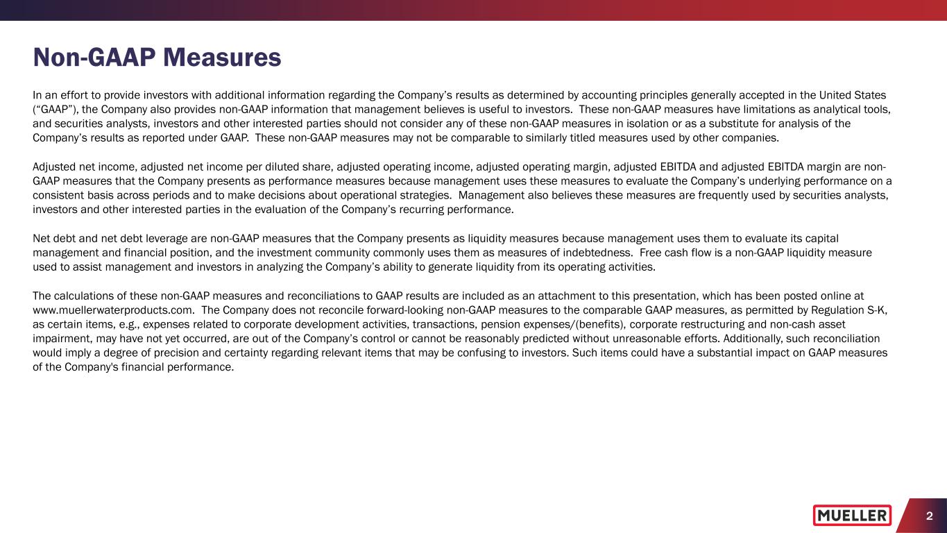 2 Non-GAAP Measures In an effort to provide investors with additional information regarding the Company’s results as determined by accounting principles generally accepted in the United States (“GAAP”), the Company also provides non-GAAP information that management believes is useful to investors. These non-GAAP measures have limitations as analytical tools, and securities analysts, investors and other interested parties should not consider any of these non-GAAP measures in isolation or as a substitute for analysis of the Company’s results as reported under GAAP. These non-GAAP measures may not be comparable to similarly titled measures used by other companies. Adjusted net income, adjusted net income per diluted share, adjusted operating income, adjusted operating margin, adjusted EBITDA and adjusted EBITDA margin are non- GAAP measures that the Company presents as performance measures because management uses these measures to evaluate the Company’s underlying performance on a consistent basis across periods and to make decisions about operational strategies. Management also believes these measures are frequently used by securities analysts, investors and other interested parties in the evaluation of the Company’s recurring performance. Net debt and net debt leverage are non-GAAP measures that the Company presents as liquidity measures because management uses them to evaluate its capital management and financial position, and the investment community commonly uses them as measures of indebtedness. Free cash flow is a non-GAAP liquidity measure used to assist management and investors in analyzing the Company’s ability to generate liquidity from its operating activities. The calculations of these non-GAAP measures and reconciliations to GAAP results are included as an attachment to this presentation, which has been posted online at www.muellerwaterproducts.com. The Company does not reconcile forward-looking non-GAAP measures to the comparable GAAP measures, as permitted by Regulation S-K, as certain items, e.g., expenses related to corporate development activities, transactions, pension expenses/(benefits), corporate restructuring and non-cash asset impairment, may have not yet occurred, are out of the Company’s control or cannot be reasonably predicted without unreasonable efforts. Additionally, such reconciliation would imply a degree of precision and certainty regarding relevant items that may be confusing to investors. Such items could have a substantial impact on GAAP measures of the Company's financial performance.
