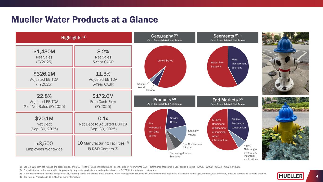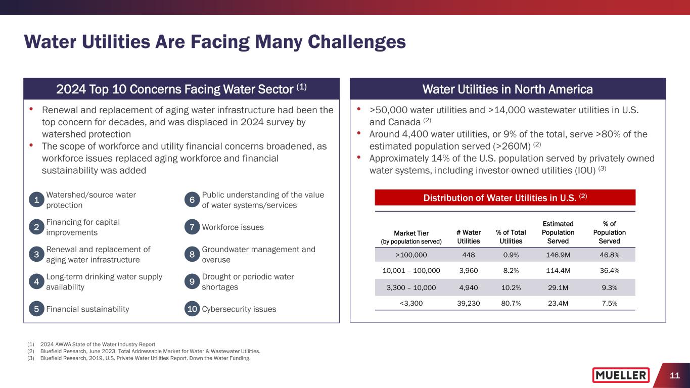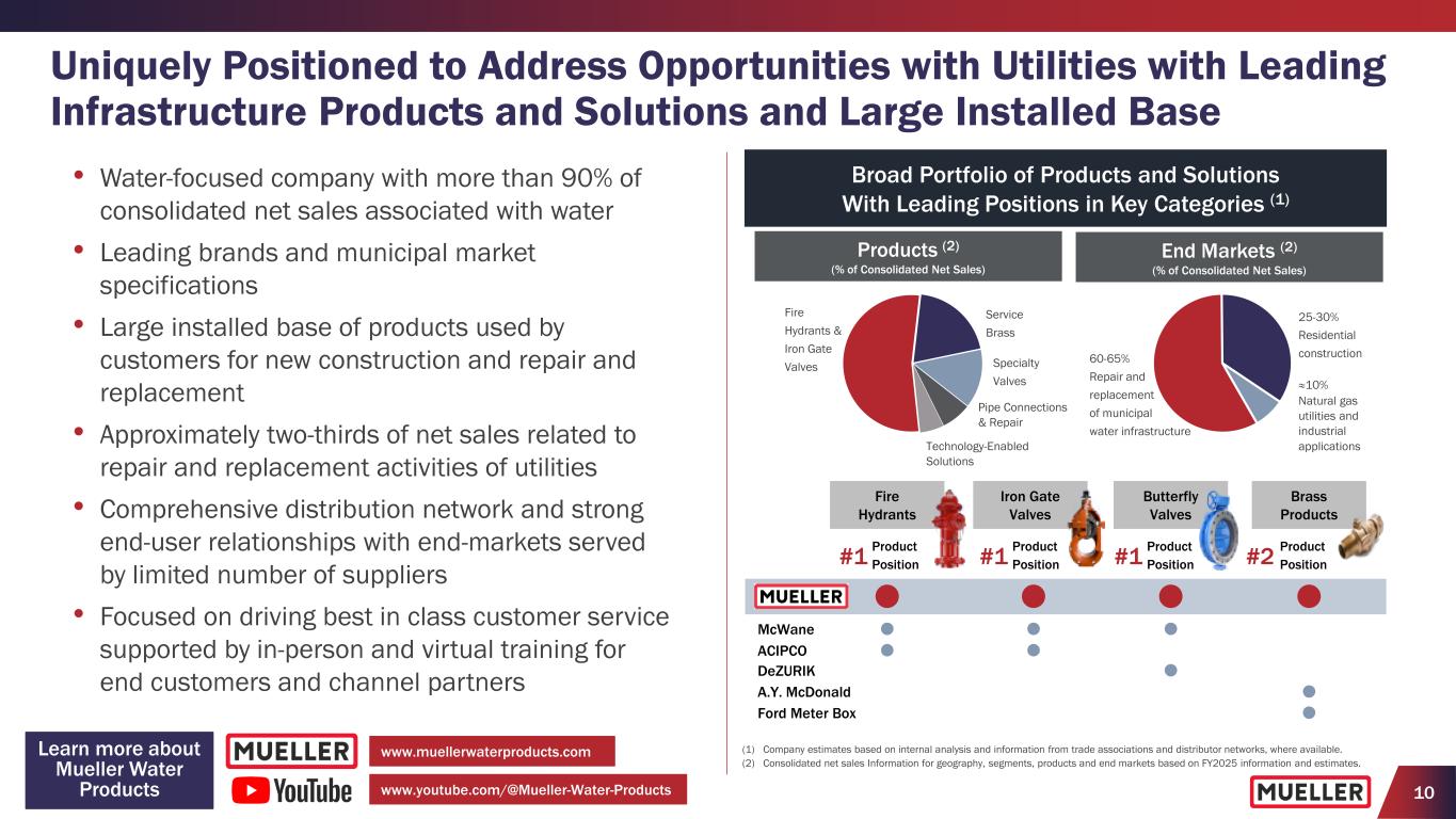 10 Leading Product Positions in Key Product Categories (1) (1) Company estimates based on internal analysis and information from trade associations and distributor networks, where available. (2) Consolidated net sales Information for geography, segments, products and end markets based on FY2025 information and estimates. Fire Hydrants Iron Gate Valves Butterfly Valves Brass Products #1 Product Position A.Y. McDonald ACIPCO DeZURIK Ford Meter Box McWane #1 Product Position #1 Product Position #2 Product Position Broad Portfolio of Products and Solutions With Leading Positions in Key Categories (1) Uniquely Positioned to Address Opportunities with Utilities with Leading Infrastructure Products and Solutions and Large Installed Base • Water-focused compa y with more than 90% of consolidated net sales associated with water • Leading brands and municipal market specifications • Large installed base of products used by customers for new construction and repair and replacement • Approximately two-thirds of net sales related to repair and replacement activities of utilities • Comprehensive distribution network and strong end-user relationships with end-markets served by limited number of suppliers • Focused on driving best in class customer service supported by in-person and virtual training for end customers and channel partners www.youtube.com/@Mueller-Water-Products www.muellerwaterproducts.comLearn more about Mueller Water Products ≈10% Natural gas utilities and industrial applications 60-65% Repair and replacement of municipal water infrastructure 25-30% Residential construction Service Brass Fire Hydrants & Iron Gate Valves Specialty Valves Technology-Enabled Solutions Products (2) (% of Consolidated Net Sales) End Markets (2) (% of Consolidated Net Sales) Pipe Connections & Repair