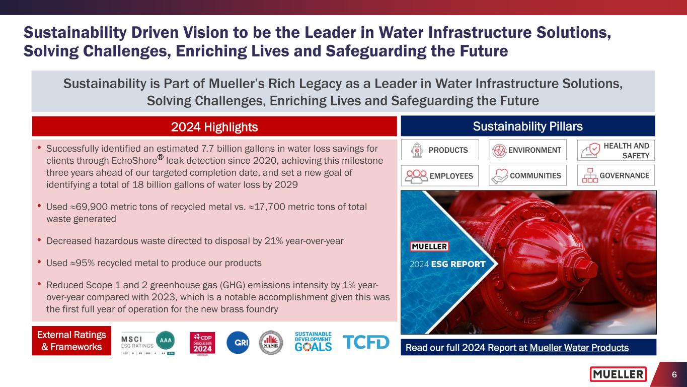 5 Why Invest in Mueller LEADING BRANDS WITH LARGE INSTALLED BASE OF INNOVATIVE INFRASTRUCTURE PRODUCTS AND SOLUTIONS BENEFITING FROM LONG-TERM END MARKET DYNAMICS SUPPORTED BY AGING WATER INFRASTRUCTURE DRIVING OPERATIONAL EXCELLENCE AND EXPANDING CAPABILITIES TO FURTHER EXPAND GROSS MARGINS ENHANCING CUSTOMER EXPERIENCE TO DRIVE GROWTH THROUGH COMPREHENSIVE DISTRIBUTION NETWORK INCREASING MARGINS AND FREE CASH FLOW SUPPORT FUTURE INVESTMENTS AND GROWTH Continued investments in customer experience, product innovation and operational excellence support further net sales growth and margin improvements SUPPORTING STRATEGIC PRIORITIES THROUGH BALANCE SHEET WITH AMPLE CAPACITY, LIQUIDITY AND FLEXIBILITY