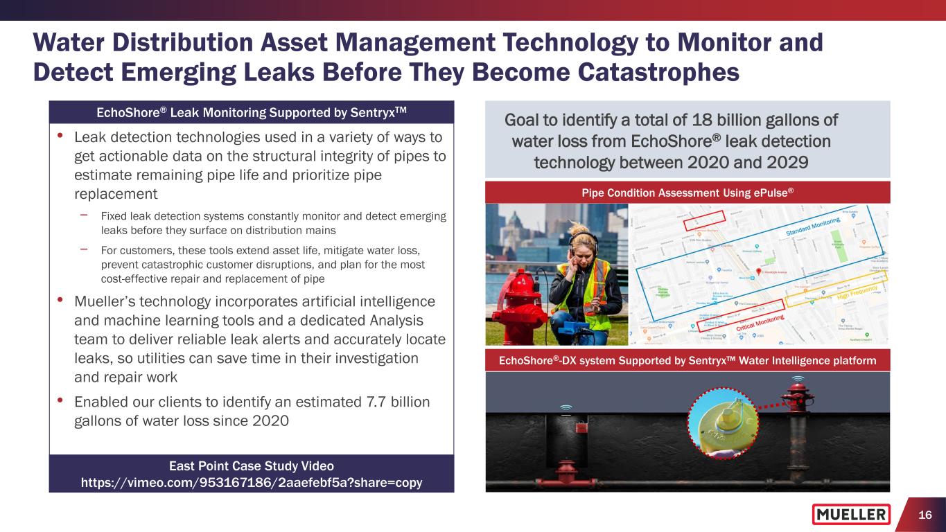 15 Technology-Enabled Products and Solutions Help Address Critical Needs for Water Utilities ControlMonitor Manage Optimize Mueller’s Product Offerings Aging Infrastructure Non-Revenue Water Climate Change Population Shifts Water Scarcity Aging Workforce Consumer Awareness Digitization Challenges Facing Water Utilities Urbanization Fixed Leak Detection and Pipe Condition Assessment Metering Pressure Monitoring and Control “Bluefield projects digital water spending in U.S. and Canada to grow at an 8.4% CAGR (2024 to 2033), highlighting the increasing reliance on digital solutions to manage water infrastructure more efficiently.” (1) Bluefield Research, August 2024 (1) Bluefield Research, August 2024, “U.S. & Canada Digital Water Market Outlook. Key Drivers, Competitive Shifts, and Forecasts, 2024–2033”