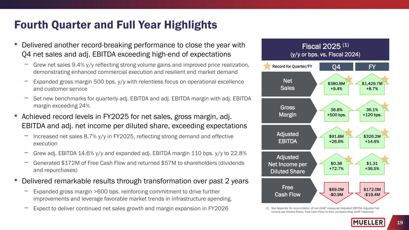 19 • Delivered another record-breaking performance to close the year with Q4 net sales and adj. EBITDA exceeding high-end of expectations − Grew net sales 9.4% y/y reflecting strong volume gains and improved price realization, demonstrating enhanced commercial execution and resilient end market demand − Expanded gross margin 500 bps. y/y with relentless focus on operational excellence and customer service − Set new benchmarks for quarterly adj. EBITDA and adj. EBITDA margin with adj. EBITDA margin exceeding 24% • Achieved record levels in FY2025 for net sales, gross margin, adj. EBITDA and adj. net income per diluted share, exceeding expectations − Increased net sales 8.7% y/y in FY2025, reflecting strong demand and effective execution − Grew adj. EBITDA 14.6% y/y and expanded adj. EBITDA margin 110 bps. y/y to 22.8% − Generated $172M of Free Cash Flow and returned $57M to shareholders (dividends and repurchases) • Delivered remarkable results through transformation over past 2 years − Expanded gross margin >600 bps. reinforcing commitment to drive further improvements and leverage favorable market trends in infrastructure spending. − Expect to deliver continued net sales growth and margin expansion in FY2026 Fourth Quarter and Full Year Highlights (1) See Appendix for reconciliation of non-GAAP measures (Adjusted EBITDA, Adjusted Net Income per Diluted Share, Free Cash Flow) to their corresponding GAAP measures. Q4 Fiscal 2025 (1) (y/y or bps. vs. Fiscal 2024) Net Sales $380.8M +9.4% Gross Margin Adjusted EBITDA $91.8M +26.6% Free Cash Flow $69.0M -$0.9M Adjusted Net Income per Diluted Share $0.38 +72.7% FY $1,429.7M +8.7% $326.2M +14.6% $1.31 +36.5% $172.0M -$19.4M 36.8% +500 bps. 36.1% +120 bps. Record for Quarter/FY