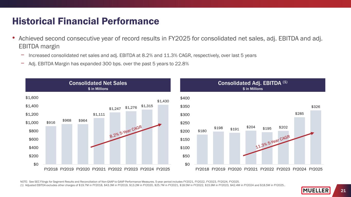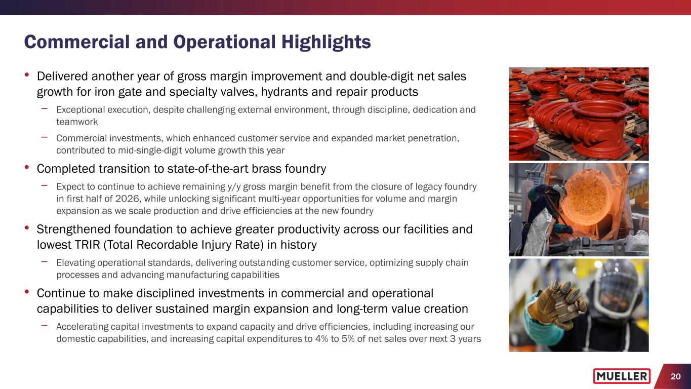 20 • Delivered another year of gross margin improvement and double-digit net sales growth for iron gate and specialty valves, hydrants and repair products − Exceptional execution, despite challenging external environment, through discipline, dedication and teamwork − Commercial investments, which enhanced customer service and expanded market penetration, contributed to mid-single-digit volume growth this year • Completed transition to state-of-the-art brass foundry − Expect to continue to achieve remaining y/y gross margin benefit from the closure of legacy foundry in first half of 2026, while unlocking significant multi-year opportunities for volume and margin expansion as we scale production and drive efficiencies at the new foundry • Strengthened foundation to achieve greater productivity across our facilities and lowest TRIR (Total Recordable Injury Rate) in history − Elevating operational standards, delivering outstanding customer service, optimizing supply chain processes and advancing manufacturing capabilities • Continue to make disciplined investments in commercial and operational capabilities to deliver sustained margin expansion and long-term value creation − Accelerating capital investments to expand capacity and drive efficiencies, including increasing our domestic capabilities, and increasing capital expenditures to 4% to 5% of net sales over next 3 years Commercial and Operational Highlights