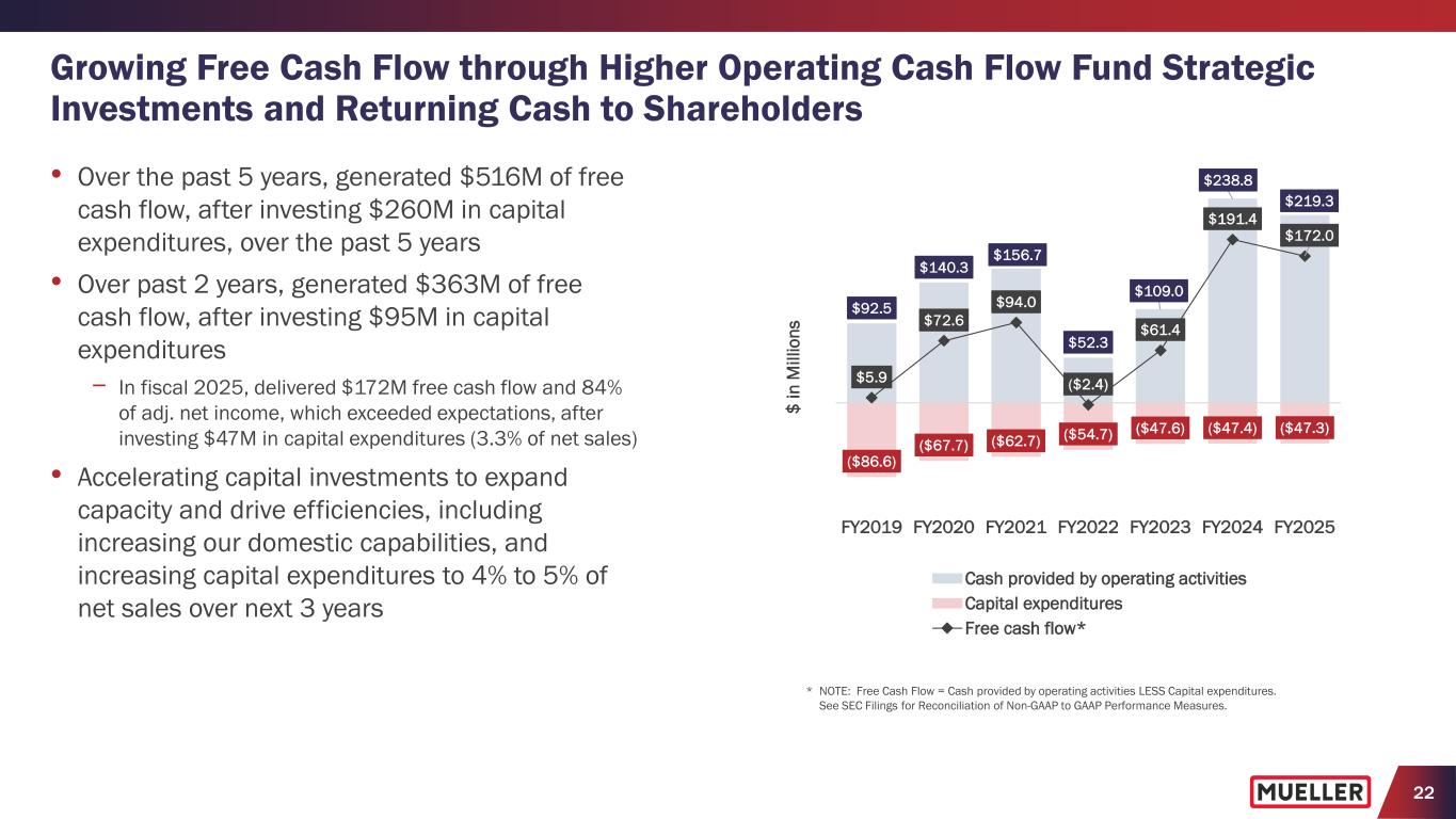 21 Historical Financial Performance • Achieved second consecutive year of record results in FY2025 for consolidated net sales, adj. EBITDA and adj. EBITDA margin − Increased consolidated net sales and adj. EBITDA at 8.2% and 11.3% CAGR, respectively, over last 5 years − Adj. EBITDA Margin has expanded 300 bps. over the past 5 years to 22.8% $916 $968 $964 $1,111 $1,247 $1,276 $1,315 $1,430 $0 $200 $400 $600 $800 $1,000 $1,200 $1,400 $1,600 FY2018 FY2019 FY2020 FY2021 FY2022 FY2023 FY2024 FY2025 $180 $198 $191 $204 $195 $202 $285 $326 $0 $50 $100 $150 $200 $250 $300 $350 $400 FY2018 FY2019 FY2020 FY2021 FY2022 FY2023 FY2024 FY2025 NOTE: See SEC Filings for Segment Results and Reconciliation of Non-GAAP to GAAP Performance Measures. 5-year period includes FY2021, FY2022, FY2023, FY2024, FY2025. (1) Adjusted EBITDA excludes other charges of $19.7M in FY2018, $43.3M in FY2019, $13.2M in FY2020, $25.7M in FY2021, $18.5M in FY2022, $15.9M in FY2023, $42.4M in FY2024 and $18.5M in FY2025.. Consolidated Net Sales $ in Millions Consolidated Adj. EBITDA (1) $ in Millions