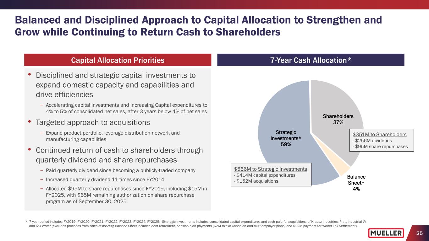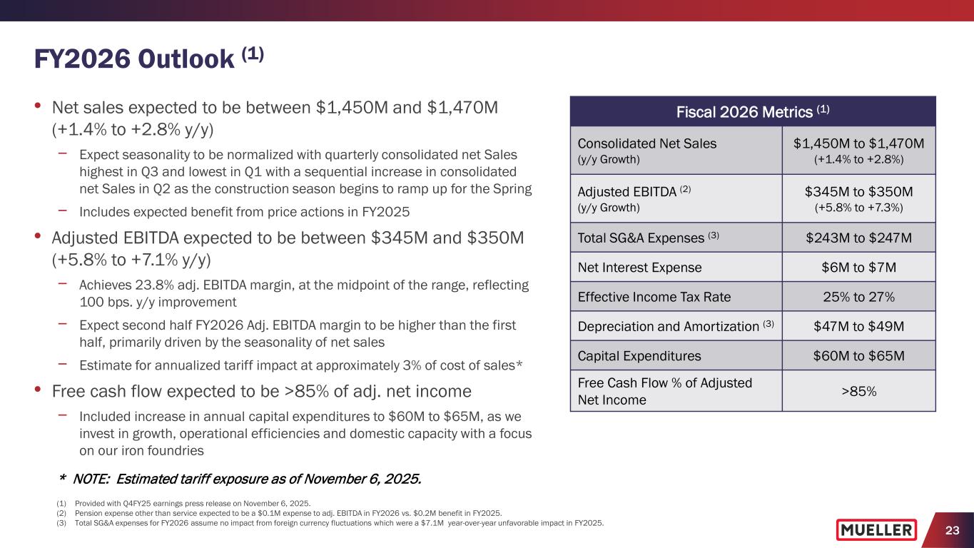 23 FY2026 Outlook (1) • Net sales expected to be between $1,450M and $1,470M (+1.4% to +2.8% y/y) − Expect seasonality to be normalized with quarterly consolidated net Sales highest in Q3 and lowest in Q1 with a sequential increase in consolidated net Sales in Q2 as the construction season begins to ramp up for the Spring − Includes expected benefit from price actions in FY2025 • Adjusted EBITDA expected to be between $345M and $350M (+5.8% to +7.1% y/y) − Achieves 23.8% adj. EBITDA margin, at the midpoint of the range, reflecting 100 bps. y/y improvement − Expect second half FY2026 Adj. EBITDA margin to be higher than the first half, primarily driven by the seasonality of net sales − Estimate for annualized tariff impact at approximately 3% of cost of sales* • Free cash flow expected to be >85% of adj. net income − Included increase in annual capital expenditures to $60M to $65M, as we invest in growth, operational efficiencies and domestic capacity with a focus on our iron foundries (1) Provided with Q4FY25 earnings press release on November 6, 2025. (2) Pension expense other than service expected to be a $0.1M expense to adj. EBITDA in FY2026 vs. $0.2M benefit in FY2025. (3) Total SG&A expenses for FY2026 assume no impact from foreign currency fluctuations which were a $7.1M year-over-year unfavorable impact in FY2025. Fiscal 2026 Metrics (1) Consolidated Net Sales (y/y Growth) $1,450M to $1,470M (+1.4% to +2.8%) Adjusted EBITDA (2) (y/y Growth) $345M to $350M (+5.8% to +7.3%) Total SG&A Expenses (3) $243M to $247M Net Interest Expense $6M to $7M Effective Income Tax Rate 25% to 27% Depreciation and Amortization (3) $47M to $49M Capital Expenditures $60M to $65M Free Cash Flow % of Adjusted Net Income >85% * NOTE: Estimated tariff exposure as of November 6, 2025.