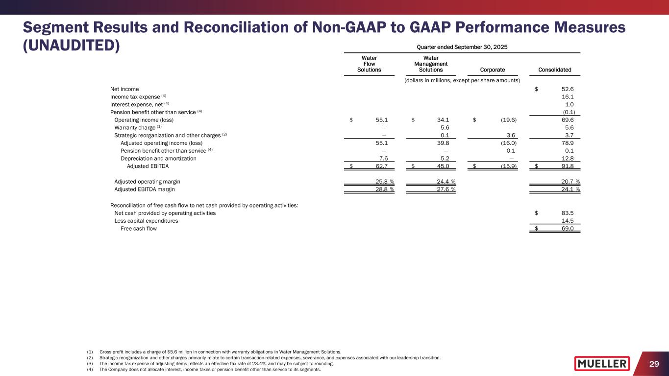 28 Segment Results and Reconciliation of Non-GAAP to GAAP Performance Measures (UNAUDITED) (1) Gross profit includes a charge of $5.6 million in connection with warranty obligations in Water Management Solutions. (2) Strategic reorganization and other charges primarily relate to certain transaction-related expenses, severance, and expenses associated with our leadership transition. (3) The income tax expense of adjusting items reflects an effective tax rate of 23.4%, and may be subject to rounding. Quarter ended September 30, 2025 Water Flow Solutions Water Management Solutions Corporate Consolidated (dollars in millions, except per share amounts) Net sales $ 217.5 $ 163.3 $ — $ 380.8 Gross profit (1) $ 80.4 $ 59.6 $ — $ 140.0 Selling, general and administrative expenses 25.3 25.4 16.0 66.7 Strategic reorganization and other charges (2) — 0.1 3.6 3.7 Operating income (loss) $ 55.1 $ 34.1 $ (19.6) $ 69.6 Operating margin 25.3 % 20.9 % 18.3 % Capital expenditures $ 8.3 $ 6.2 $ — $ 14.5 Net income $ 52.6 Net income margin 13.8 % Reconciliation of non-GAAP to GAAP performance measures: Net income $ 52.6 Warranty charge (1) 5.6 Strategic reorganization and other charges (2) 3.7 Income tax expense of adjusting items (3) (2.2) Adjusted net income $ 59.7 Weighted average diluted shares outstanding 157.4 Net income per diluted share $ 0.33 Warranty charge per diluted share 0.04 Strategic reorganization and other charges per diluted share 0.02 Income tax expense of adjusting items per diluted share (0.01) Adjusted net income per diluted share $ 0.38
