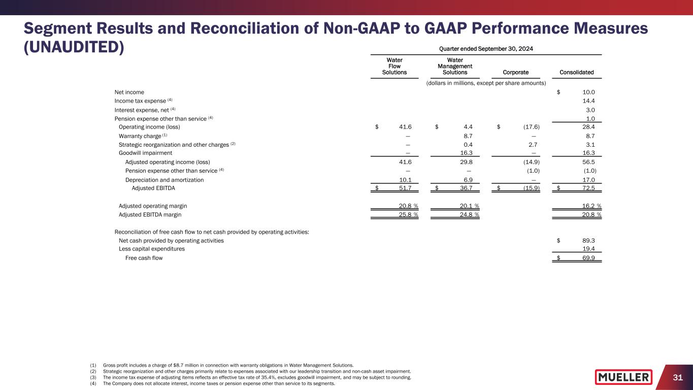 30 Segment Results and Reconciliation of Non-GAAP to GAAP Performance Measures (UNAUDITED) (1) Gross profit includes a charge of $8.7 million in connection with warranty obligations in Water Management Solutions. (2) Strategic reorganization and other charges primarily relate to expenses associated with our leadership transition and non-cash asset impairment. (3) The income tax expense of adjusting items reflects an effective tax rate of 35.4%, excludes goodwill impairment, and may be subject to rounding. Quarter ended September 30, 2024 Water Flow Solutions Water Management Solutions Corporate Consolidated (dollars in millions, except per share amounts) Net sales $ 200.3 $ 147.9 $ — $ 348.2 Gross profit (1) $ 66.2 $ 44.7 $ — $ 110.9 Selling, general and administrative expenses 24.6 23.6 14.9 63.1 Strategic reorganization and other charges (2) — 0.4 2.7 3.1 Goodwill impairment — 16.3 — 16.3 Operating income (loss) $ 41.6 $ 4.4 $ (17.6) $ 28.4 Operating margin 20.8 % 3.0 % 8.2 % Capital expenditures $ 15.0 $ 4.4 $ — $ 19.4 Net income $ 10.0 Net income margin 2.9 % Reconciliation of non-GAAP to GAAP performance measures: Net income $ 10.0 Warranty charge (1) 8.7 Strategic reorganization and other charges (2) 3.1 Goodwill impairment 16.3 Income tax expense of adjusting items (3) (4.2) Adjusted net income $ 33.9 Weighted average diluted shares outstanding 157.5 Net income per diluted share $ 0.06 Warranty charge per diluted share (1) 0.06 Strategic reorganization and other charges per diluted share (2) 0.02 Goodwill impairment per diluted share 0.10 Income tax expense of adjusting items per diluted share (3) (0.02) Adjusted net income per diluted share $ 0.22