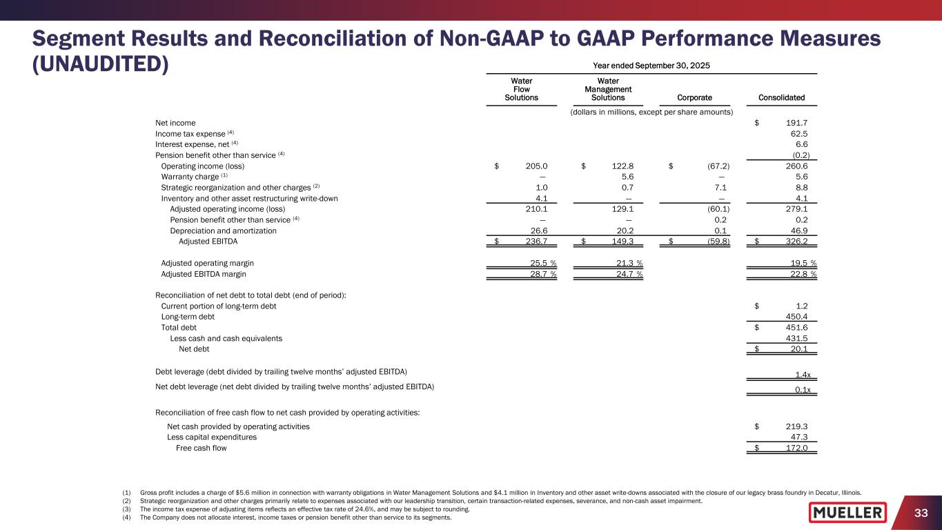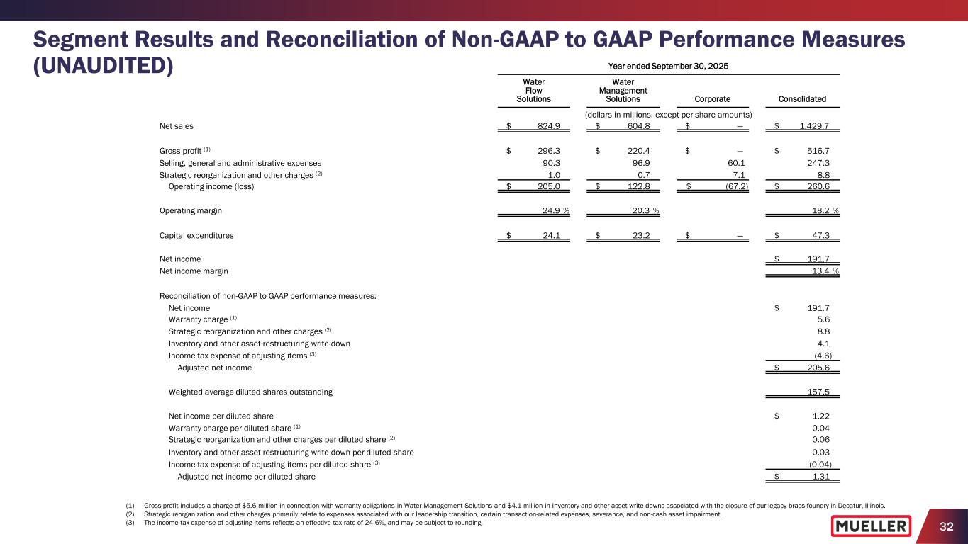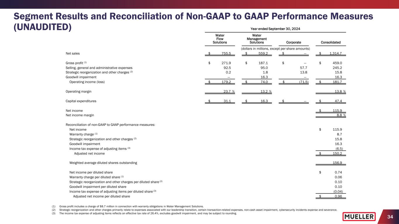 32 Segment Results and Reconciliation of Non-GAAP to GAAP Performance Measures (UNAUDITED) (1) Gross profit includes a charge of $5.6 million in connection with warranty obligations in Water Management Solutions and $4.1 million in Inventory and other asset write-downs associated with the closure of our legacy brass foundry in Decatur, Illinois. (2) Strategic reorganization and other charges primarily relate to expenses associated with our leadership transition, certain transaction-related expenses, severance, and non-cash asset impairment. (3) The income tax expense of adjusting items reflects an effective tax rate of 24.6%, and may be subject to rounding. Year ended September 30, 2025 Water Flow Solutions Water Management Solutions Corporate Consolidated (dollars in millions, except per share amounts) Net sales $ 824.9 $ 604.8 $ — $ 1,429.7 Gross profit (1) $ 296.3 $ 220.4 $ — $ 516.7 Selling, general and administrative expenses 90.3 96.9 60.1 247.3 Strategic reorganization and other charges (2) 1.0 0.7 7.1 8.8 Operating income (loss) $ 205.0 $ 122.8 $ (67.2) $ 260.6 Operating margin 24.9 % 20.3 % 18.2 % Capital expenditures $ 24.1 $ 23.2 $ — $ 47.3 Net income $ 191.7 Net income margin 13.4 % Reconciliation of non-GAAP to GAAP performance measures: Net income $ 191.7 Warranty charge (1) 5.6 Strategic reorganization and other charges (2) 8.8 Inventory and other asset restructuring write-down 4.1 Income tax expense of adjusting items (3) (4.6) Adjusted net income $ 205.6 Weighted average diluted shares outstanding 157.5 Net income per diluted share $ 1.22 Warranty charge per diluted share (1) 0.04 Strategic reorganization and other charges per diluted share (2) 0.06 Inventory and other asset restructuring write-down per diluted share 0.03 Income tax expense of adjusting items per diluted share (3) (0.04) Adjusted net income per diluted share $ 1.31