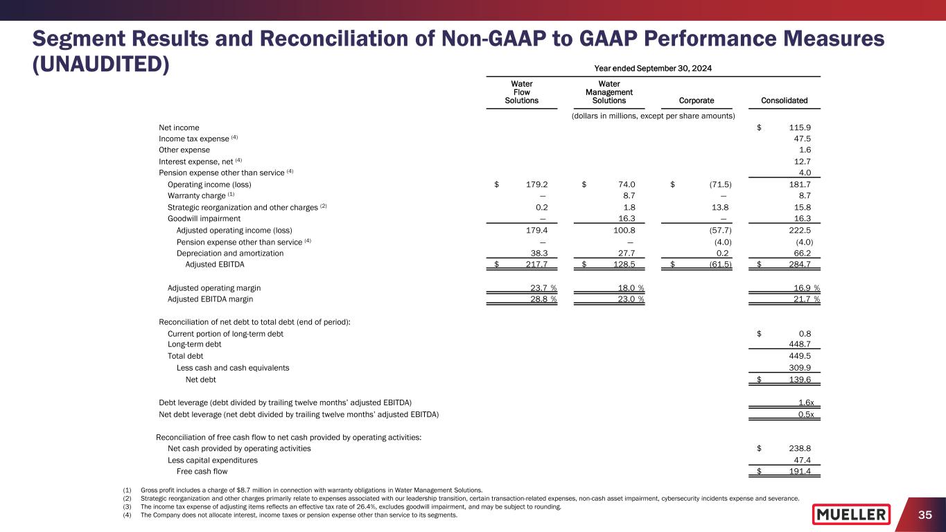 34 Segment Results and Reconciliation of Non-GAAP to GAAP Performance Measures (UNAUDITED) (1) Gross profit includes a charge of $8.7 million in connection with warranty obligations in Water Management Solutions. (2) Strategic reorganization and other charges primarily relate to expenses associated with our leadership transition, certain transaction-related expenses, non-cash asset impairment, cybersecurity incidents expense and severance. (3) The income tax expense of adjusting items reflects an effective tax rate of 26.4%, excludes goodwill impairment, and may be subject to rounding. Year ended September 30, 2024 Water Flow Solutions Water Management Solutions Corporate Consolidated (dollars in millions, except per share amounts) Net sales $ 755.5 $ 559.2 $ — $ 1,314.7 Gross profit (1) $ 271.9 $ 187.1 $ — $ 459.0 Selling, general and administrative expenses 92.5 95.0 57.7 245.2 Strategic reorganization and other charges (2) 0.2 1.8 13.8 15.8 Goodwill impairment — 16.3 — 16.3 Operating income (loss) $ 179.2 $ 74.0 $ (71.5) $ 181.7 Operating margin 23.7 % 13.2 % 13.8 % Capital expenditures $ 31.1 $ 16.3 $ — $ 47.4 Net income $ 115.9 Net income margin 8.8 % Reconciliation of non-GAAP to GAAP performance measures: Net income $ 115.9 Warranty charge (1) 8.7 Strategic reorganization and other charges (2) 15.8 Goodwill impairment 16.3 Income tax expense of adjusting items (3) (6.5) Adjusted net income $ 150.2 Weighted average diluted shares outstanding 156.9 Net income per diluted share $ 0.74 Warranty charge per diluted share (1) 0.06 Strategic reorganization and other charges per diluted share (2) 0.10 Goodwill impairment per diluted share 0.10 Income tax expense of adjusting items per diluted share (3) (0.04) Adjusted net income per diluted share $ 0.96