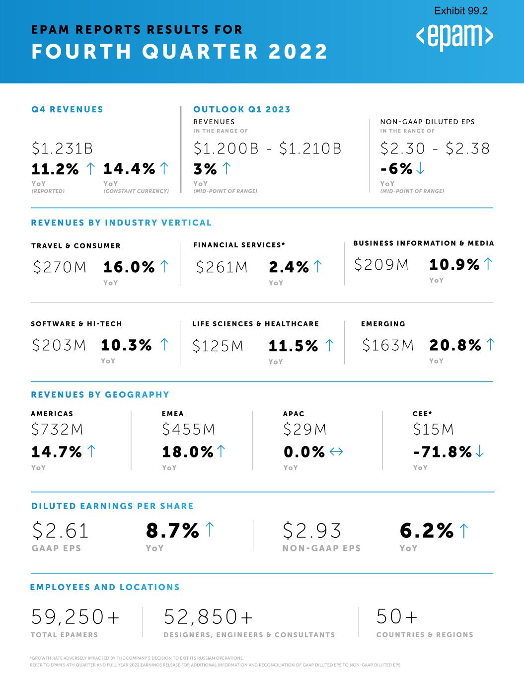 YoY 16.0% T R A V E L & C O N S U M E R $270M N O N - G A A P E P S $2.93 YoY 8.7% YoY 2.4% F I N A N C I A L S E R V I C E S * $261M YoY 6.2% YoY 14.7% YoY 20.8% YoY R E V E N U E S B Y I N D U S T R Y V E R T I C A L R E V E N U E S B Y G E O G R A P H Y O U T L O O K Q 1 2 0 2 3Q 4 R E V E N U E S YoY (REPORTED) YoY (CONSTANT CURRENCY) E P A M R E P O R T S R E S U LT S F O R F O U R T H Q U A R T E R 2 0 2 2 $1.231B 11.2% 14.4% YoY (MID-POINT OF RANGE) $1.200B - $1.210B 3% R E V E N U E S I N T H E R A N G E O F YoY (MID-POINT OF RANGE) $2.30 - $2.38 -6% NON-GAAP DILUTED EPS I N T H E R A N G E O F $209M YoY 10.9% B U S I N E S S I N F O R M AT I O N & M E D I A A M E R I C A S $732M G A A P E P S $2.61 E M P L O Y E E S A N D L O C AT I O N S *GROWTH RATE ADVERSELY IMPACTED BY THE COMPANY’S DECISION TO EXIT ITS RUSSIAN OPERATIONS. REFER TO EPAM’S 4TH QUARTER AND FULL YEAR 2022 EARNINGS RELEASE FOR ADDITIONAL INFORMATION AND RECONCILIATION OF GAAP DILUTED EPS TO NON-GAAP DILUTED EPS. 59,250+ T O TA L E P A M E R S 52,850+ D E S I G N E R S , E N G I N E E R S & C O N S U LTA N T S E M E A $455M YoY 18.0% 50+ C O U N T R I E S & R E G I O N S YoY -71.8% C E E * $15M A P A C $29M YoY 0.0% 11.5% L I F E S C I E N C E S & H E A LT H C A R E $125M E M E R G I N G YoY 10.3% S O F T W A R E & H I -T E C H $203M $163M D I L U T E D E A R N I N G S P E R S H A R E Exhibit 99.2