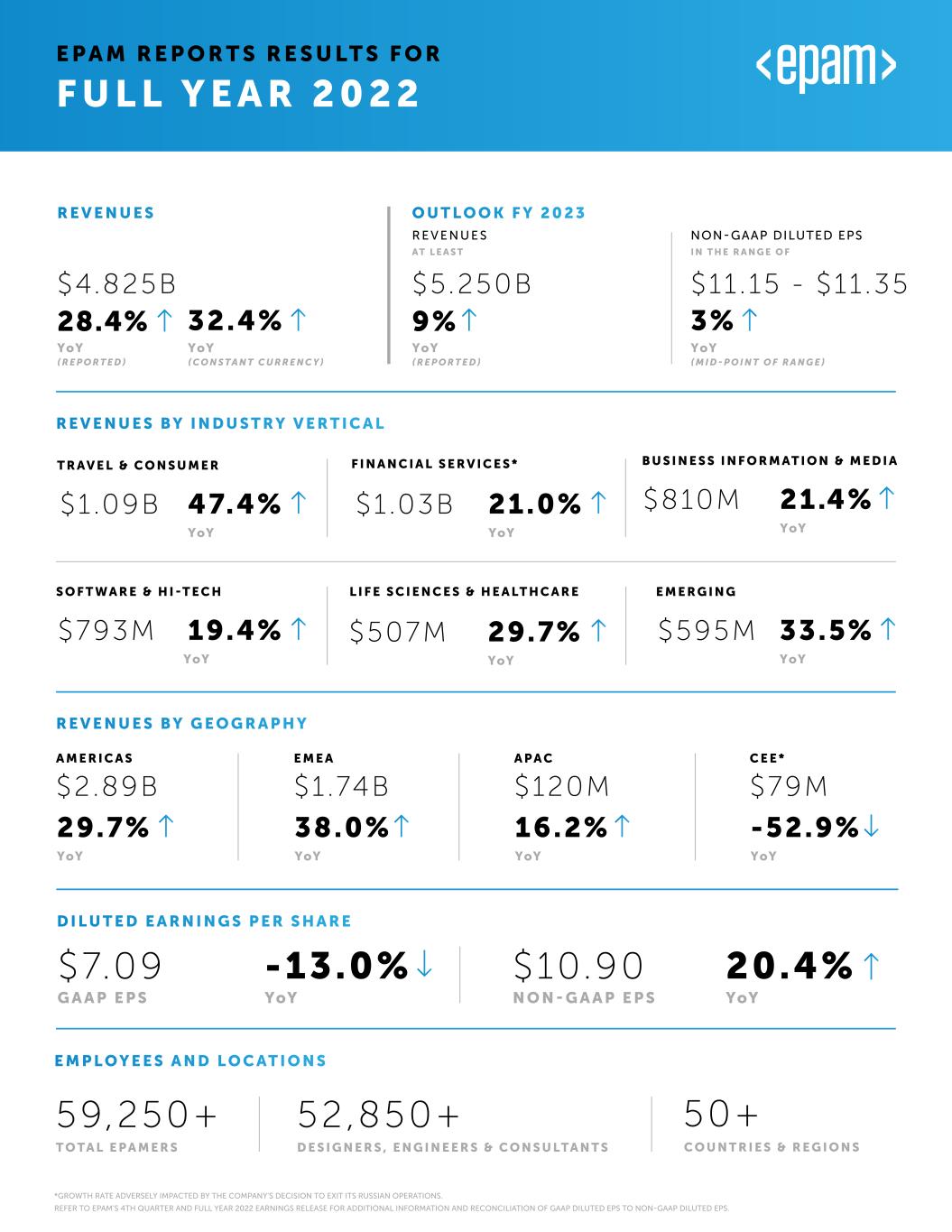 9% N O N - G A A P E P S $10.90 YoY -13.0% YoY 20.4% YoY 29.7% YoY 33.5% YoY R E V E N U E S B Y G E O G R A P H Y O U T L O O K F Y 2 0 2 3R E V E N U E S YoY ( R E P O R T E D ) YoY ( M I D - P O I N T O F R A N G E ) YoY ( C O N S TA N T C U R R E N C Y ) E P A M R E P O R T S R E S U LT S F O R F U L L Y E A R 2 0 2 2 $4.825B 28.4% 32.4% YoY ( R E P O R T E D ) $5.250B R E V E N U E S AT L E A S T $11.15 - $11.35 3% NON-GAAP DILUTED EPS I N T H E R A N G E O F YoY 47.4% T R A V E L & C O N S U M E R $1.09B YoY 21.0% F I N A N C I A L S E R V I C E S * $1.03B R E V E N U E S B Y I N D U S T R Y V E R T I C A L $810M YoY 21.4% B U S I N E S S I N F O R M AT I O N & M E D I A A M E R I C A S $2.89B G A A P E P S $7.09 E M P L O Y E E S A N D L O C AT I O N S *GROWTH RATE ADVERSELY IMPACTED BY THE COMPANY’S DECISION TO EXIT ITS RUSSIAN OPERATIONS. REFER TO EPAM’S 4TH QUARTER AND FULL YEAR 2022 EARNINGS RELEASE FOR ADDITIONAL INFORMATION AND RECONCILIATION OF GAAP DILUTED EPS TO NON-GAAP DILUTED EPS. 59,250+ T O TA L E P A M E R S 52,850+ D E S I G N E R S , E N G I N E E R S & C O N S U LTA N T S E M E A $1.74B YoY 38.0% 50+ C O U N T R I E S & R E G I O N S YoY -52.9% C E E * $79M A P A C $120M YoY 16.2% 29.7% L I F E S C I E N C E S & H E A LT H C A R E $507M E M E R G I N G YoY 19.4% S O F T W A R E & H I -T E C H $793M $595M D I L U T E D E A R N I N G S P E R S H A R E