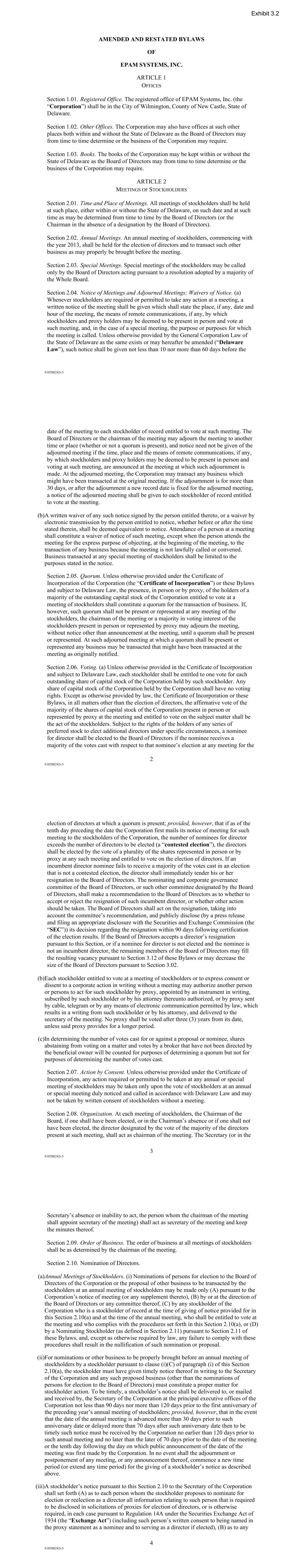 #10388242v3 AMENDED AND RESTATED BYLAWS OF EPAM SYSTEMS, INC. ARTICLE 1 OFFICES Section 1.01. Registered Office. The registered office of EPAM Systems, Inc. (the “Corporation”) shall be in the City of Wilmington, County of New Castle, State of Delaware. Section 1.02. Other Offices. The Corporation may also have offices at such other places both within and without the State of Delaware as the Board of Directors may from time to time determine or the business of the Corporation may require. Section 1.03. Books. The books of the Corporation may be kept within or without the State of Delaware as the Board of Directors may from time to time determine or the business of the Corporation may require. ARTICLE 2 MEETINGS OF STOCKHOLDERS Section 2.01. Time and Place of Meetings. All meetings of stockholders shall be held at such place, either within or without the State of Delaware, on such date and at such time as may be determined from time to time by the Board of Directors (or the Chairman in the absence of a designation by the Board of Directors). Section 2.02. Annual Meetings. An annual meeting of stockholders, commencing with the year 2013, shall be held for the election of directors and to transact such other business as may properly be brought before the meeting. Section 2.03. Special Meetings. Special meetings of the stockholders may be called only by the Board of Directors acting pursuant to a resolution adopted by a majority of the Whole Board. Section 2.04. Notice of Meetings and Adjourned Meetings; Waivers of Notice. (a) Whenever stockholders are required or permitted to take any action at a meeting, a written notice of the meeting shall be given which shall state the place, if any, date and hour of the meeting, the means of remote communications, if any, by which stockholders and proxy holders may be deemed to be present in person and vote at such meeting, and, in the case of a special meeting, the purpose or purposes for which the meeting is called. Unless otherwise provided by the General Corporation Law of the State of Delaware as the same exists or may hereafter be amended (“Delaware Law”), such notice shall be given not less than 10 nor more than 60 days before the Exhibit 3.2 2 #10388242v3 date of the meeting to each stockholder of record entitled to vote at such meeting. The Board of Directors or the chairman of the meeting may adjourn the meeting to another time or place (whether or not a quorum is present), and notice need not be given of the adjourned meeting if the time, place and the means of remote communications, if any, by which stockholders and proxy holders may be deemed to be present in person and voting at such meeting, are announced at the meeting at which such adjournment is made. At the adjourned meeting, the Corporation may transact any business which might have been transacted at the original meeting. If the adjournment is for more than 30 days, or after the adjournment a new record date is fixed for the adjourned meeting, a notice of the adjourned meeting shall be given to each stockholder of record entitled to vote at the meeting. (b)A written waiver of any such notice signed by the person entitled thereto, or a waiver by electronic transmission by the person entitled to notice, whether before or after the time stated therein, shall be deemed equivalent to notice. Attendance of a person at a meeting shall constitute a waiver of notice of such meeting, except when the person attends the meeting for the express purpose of objecting, at the beginning of the meeting, to the transaction of any business because the meeting is not lawfully called or convened. Business transacted at any special meeting of stockholders shall be limited to the purposes stated in the notice. Section 2.05. Quorum. Unless otherwise provided under the Certificate of Incorporation of the Corporation (the “Certificate of Incorporation”) or these Bylaws and subject to Delaware Law, the presence, in person or by proxy, of the holders of a majority of the outstanding capital stock of the Corporation entitled to vote at a meeting of stockholders shall constitute a quorum for the transaction of business. If, however, such quorum shall not be present or represented at any meeting of the stockholders, the chairman of the meeting or a majority in voting interest of the stockholders present in person or represented by proxy may adjourn the meeting, without notice other than announcement at the meeting, until a quorum shall be present or represented. At such adjourned meeting at which a quorum shall be present or represented any business may be transacted that might have been transacted at the meeting as originally notified. Section 2.06. Voting. (a) Unless otherwise provided in the Certificate of Incorporation and subject to Delaware Law, each stockholder shall be entitled to one vote for each outstanding share of capital stock of the Corporation held by such stockholder. Any share of capital stock of the Corporation held by the Corporation shall have no voting rights. Except as otherwise provided by law, the Certificate of Incorporation or these Bylaws, in all matters other than the election of directors, the affirmative vote of the majority of the shares of capital stock of the Corporation present in person or represented by proxy at the meeting and entitled to vote on the subject matter shall be the act of the stockholders. Subject to the rights of the holders of any series of preferred stock to elect additional directors under specific circumstances, a nominee for director shall be elected to the Board of Directors if the nominee receives a majority of the votes cast with respect to that nominee’s election at any meeting for the 3 #10388242v3 election of directors at which a quorum is present; provided, however, that if as of the tenth day preceding the date the Corporation first mails its notice of meeting for such meeting to the stockholders of the Corporation, the number of nomin