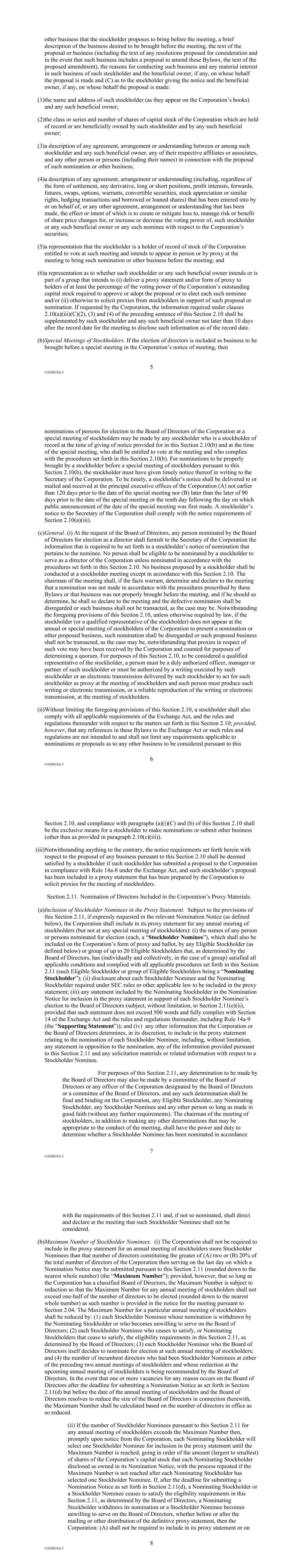 5 #10388242v3 other business that the stockholder proposes to bring before the meeting, a brief description of the business desired to be brought before the meeting, the text of the proposal or business (including the text of any resolutions proposed for consideration and in the event that such business includes a proposal to amend these Bylaws, the text of the proposed amendment), the reasons for conducting such business and any material interest in such business of such stockholder and the beneficial owner, if any, on whose behalf the proposal is made and (C) as to the stockholder giving the notice and the beneficial owner, if any, on whose behalf the proposal is made: (1)the name and address of such stockholder (as they appear on the Corporation’s books) and any such beneficial owner; (2)the class or series and number of shares of capital stock of the Corporation which are held of record or are beneficially owned by such stockholder and by any such beneficial owner; (3)a description of any agreement, arrangement or understanding between or among such stockholder and any such beneficial owner, any of their respective affiliates or associates, and any other person or persons (including their names) in connection with the proposal of such nomination or other business; (4)a description of any agreement, arrangement or understanding (including, regardless of the form of settlement, any derivative, long or short positions, profit interests, forwards, futures, swaps, options, warrants, convertible securities, stock appreciation or similar rights, hedging transactions and borrowed or loaned shares) that has been entered into by or on behalf of, or any other agreement, arrangement or understanding that has been made, the effect or intent of which is to create or mitigate loss to, manage risk or benefit of share price changes for, or increase or decrease the voting power of, such stockholder or any such beneficial owner or any such nominee with respect to the Corporation’s securities; (5)a representation that the stockholder is a holder of record of stock of the Corporation entitled to vote at such meeting and intends to appear in person or by proxy at the meeting to bring such nomination or other business before the meeting; and (6)a representation as to whether such stockholder or any such beneficial owner intends or is part of a group that intends to (i) deliver a proxy statement and/or form of proxy to holders of at least the percentage of the voting power of the Corporation’s outstanding capital stock required to approve or adopt the proposal or to elect each such nominee and/or (ii) otherwise to solicit proxies from stockholders in support of such proposal or nomination. If requested by the Corporation, the information required under clauses 2.10(a)(iii)(C)(2), (3) and (4) of the preceding sentence of this Section 2.10 shall be supplemented by such stockholder and any such beneficial owner not later than 10 days after the record date for the meeting to disclose such information as of the record date. (b)Special Meetings of Stockholders. If the election of directors is included as business to be brought before a special meeting in the Corporation’s notice of meeting, then 6 #10388242v3 nominations of persons for election to the Board of Directors of the Corporation at a special meeting of stockholders may be made by any stockholder who is a stockholder of record at the time of giving of notice provided for in this Section 2.10(b) and at the time of the special meeting, who shall be entitled to vote at the meeting and who complies with the procedures set forth in this Section 2.10(b). For nominations to be properly brought by a stockholder before a special meeting of stockholders pursuant to this Section 2.10(b), the stockholder must have given timely notice thereof in writing to the Secretary of the Corporation. To be timely, a stockholder’s notice shall be delivered to or mailed and received at the principal executive offices of the Corporation (A) not earlier than 120 days prior to the date of the special meeting nor (B) later than the later of 90 days prior to the date of the special meeting or the tenth day following the day on which public announcement of the date of the special meeting was first made. A stockholder’s notice to the Secretary of the Corporation shall comply with the notice requirements of Section 2.10(a)(iii). (c)General. (i) At the request of the Board of Directors, any person nominated by the Board of Directors for election as a director shall furnish to the Secretary of the Corporation the information that is required to be set forth in a stockholder’s notice of nomination that pertains to the nominee. No person shall be eligible to be nominated by a stockholder to serve as a director of the Corporation unless nominated in accordance with the procedures set forth in this Section 2.10. No business proposed by a stockholder shall be conducted at a stockholder meeting except in accordance with this Section 2.10. The chairman of the meeting shall, if the facts warrant, determine and declare to the meeting that a nomination was not made in accordance with the procedures prescribed by these Bylaws or that business was not properly brought before the meeting, and if he should so determine, he shall so declare to the meeting and the defective nomination shall be disregarded or such business shall not be transacted, as the case may be. Notwithstanding the foregoing provisions of this Section 2.10, unless otherwise required by law, if the stockholder (or a qualified representative of the stockholder) does not appear at the annual or special meeting of stockholders of the Corporation to present a nomination or other proposed business, such nomination shall be disregarded or such proposed business shall not be transacted, as the case may be, notwithstanding that proxies in respect of such vote may have been received by the Corporation and counted for purposes of d