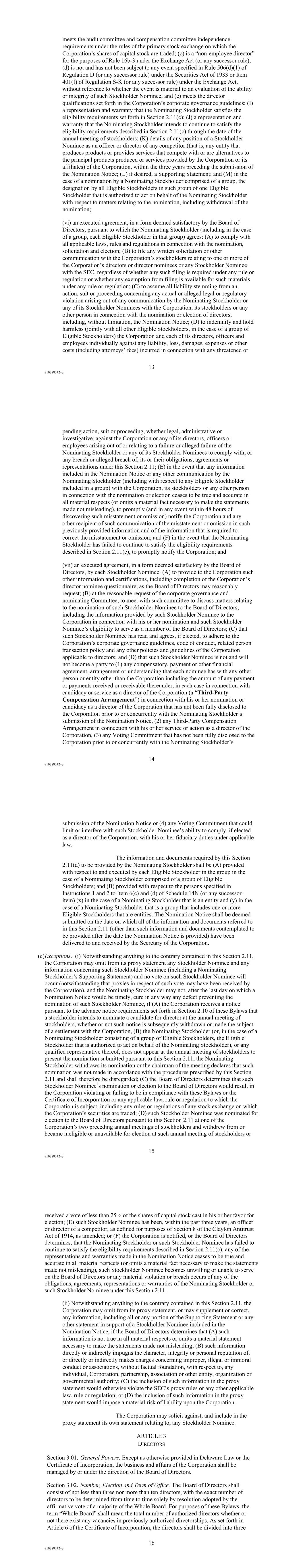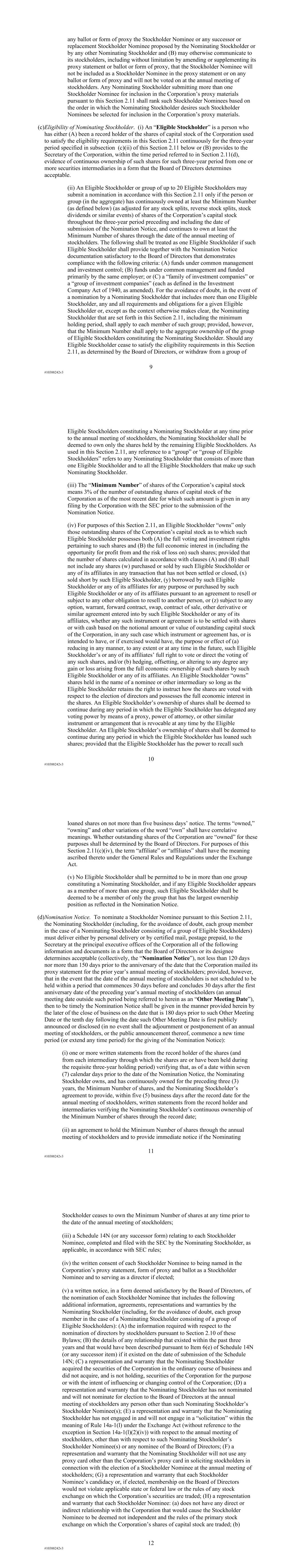 9 #10388242v3 any ballot or form of proxy the Stockholder Nominee or any successor or replacement Stockholder Nominee proposed by the Nominating Stockholder or by any other Nominating Stockholder and (B) may otherwise communicate to its stockholders, including without limitation by amending or supplementing its proxy statement or ballot or form of proxy, that the Stockholder Nominee will not be included as a Stockholder Nominee in the proxy statement or on any ballot or form of proxy and will not be voted on at the annual meeting of stockholders. Any Nominating Stockholder submitting more than one Stockholder Nominee for inclusion in the Corporation’s proxy materials pursuant to this Section 2.11 shall rank such Stockholder Nominees based on the order in which the Nominating Stockholder desires such Stockholder Nominees be selected for inclusion in the Corporation’s proxy materials. (c)Eligibility of Nominating Stockholder. (i) An “Eligible Stockholder” is a person who has either (A) been a record holder of the shares of capital stock of the Corporation used to satisfy the eligibility requirements in this Section 2.11 continuously for the three-year period specified in subsection (c)(ii) of this Section 2.11 below or (B) provides to the Secretary of the Corporation, within the time period referred to in Section 2.11(d), evidence of continuous ownership of such shares for such three-year period from one or more securities intermediaries in a form that the Board of Directors determines acceptable. (ii) An Eligible Stockholder or group of up to 20 Eligible Stockholders may submit a nomination in accordance with this Section 2.11 only if the person or group (in the aggregate) has continuously owned at least the Minimum Number (as defined below) (as adjusted for any stock splits, reverse stock splits, stock dividends or similar events) of shares of the Corporation’s capital stock throughout the three-year period preceding and including the date of submission of the Nomination Notice, and continues to own at least the Minimum Number of shares through the date of the annual meeting of stockholders. The following shall be treated as one Eligible Stockholder if such Eligible Stockholder shall provide together with the Nomination Notice documentation satisfactory to the Board of Directors that demonstrates compliance with the following criteria: (A) funds under common management and investment control; (B) funds under common management and funded primarily by the same employer; or (C) a “family of investment companies” or a “group of investment companies” (each as defined in the Investment Company Act of 1940, as amended). For the avoidance of doubt, in the event of a nomination by a Nominating Stockholder that includes more than one Eligible Stockholder, any and all requirements and obligations for a given Eligible Stockholder or, except as the context otherwise makes clear, the Nominating Stockholder that are set forth in this Section 2.11, including the minimum holding period, shall apply to each member of such group; provided, however, that the Minimum Number shall apply to the aggregate ownership of the group of Eligible Stockholders constituting the Nominating Stockholder. Should any Eligible Stockholder cease to satisfy the eligibility requirements in this Section 2.11, as determined by the Board of Directors, or withdraw from a group of 10 #10388242v3 Eligible Stockholders constituting a Nominating Stockholder at any time prior to the annual meeting of stockholders, the Nominating Stockholder shall be deemed to own only the shares held by the remaining Eligible Stockholders. As used in this Section 2.11, any reference to a “group” or “group of Eligible Stockholders” refers to any Nominating Stockholder that consists of more than one Eligible Stockholder and to all the Eligible Stockholders that make up such Nominating Stockholder. (iii) The “Minimum Number” of shares of the Corporation’s capital stock means 3% of the number of outstanding shares of capital stock of the Corporation as of the most recent date for which such amount is given in any filing by the Corporation with the SEC prior to the submission of the Nomination Notice. (iv) For purposes of this Section 2.11, an Eligible Stockholder “owns” only those outstanding shares of the Corporation’s capital stock as to which such Eligible Stockholder possesses both (A) the full voting and investment rights pertaining to such shares and (B) the full economic interest in (including the opportunity for profit from and the risk of loss on) such shares; provided that the number of shares calculated in accordance with clauses (A) and (B) shall not include any shares (w) purchased or sold by such Eligible Stockholder or any of its affiliates in any transaction that has not been settled or closed, (x) sold short by such Eligible Stockholder, (y) borrowed by such Eligible Stockholder or any of its affiliates for any purpose or purchased by such Eligible Stockholder or any of its affiliates pursuant to an agreement to resell or subject to any other obligation to resell to another person, or (z) subject to any option, warrant, forward contract, swap, contract of sale, other derivative or similar agreement entered into by such Eligible Stockholder or any of its affiliates, whether any such instrument or agreement is to be settled with shares or with cash based on the notional amount or value of outstanding capital stock of the Corporation, in any such case which instrument or agreement has, or is intended to have, or if exercised would have, the purpose or effect of (a) reducing in any manner, to any extent or at any time in the future, such Eligible Stockholder’s or any of its affiliates’ full right to vote or direct the voting of any such shares, and/or (b) hedging, offsetting, or altering to any degree any gain or loss arising from the full economic ownership of such shares by such Eligible Stockholder or