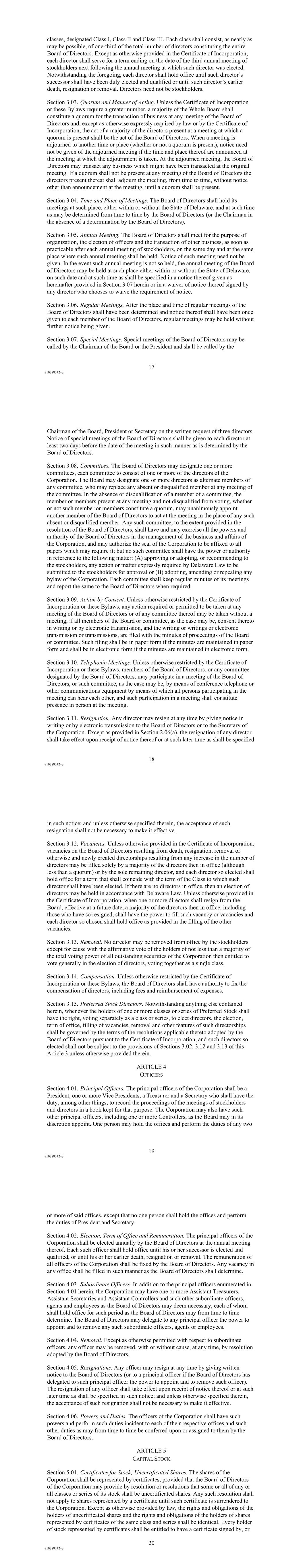 17 #10388242v3 classes, designated Class I, Class II and Class III. Each class shall consist, as nearly as may be possible, of one-third of the total number of directors constituting the entire Board of Directors. Except as otherwise provided in the Certificate of Incorporation, each director shall serve for a term ending on the date of the third annual meeting of stockholders next following the annual meeting at which such director was elected. Notwithstanding the foregoing, each director shall hold office until such director’s successor shall have been duly elected and qualified or until such director’s earlier death, resignation or removal. Directors need not be stockholders. Section 3.03. Quorum and Manner of Acting. Unless the Certificate of Incorporation or these Bylaws require a greater number, a majority of the Whole Board shall constitute a quorum for the transaction of business at any meeting of the Board of Directors and, except as otherwise expressly required by law or by the Certificate of Incorporation, the act of a majority of the directors present at a meeting at which a quorum is present shall be the act of the Board of Directors. When a meeting is adjourned to another time or place (whether or not a quorum is present), notice need not be given of the adjourned meeting if the time and place thereof are announced at the meeting at which the adjournment is taken. At the adjourned meeting, the Board of Directors may transact any business which might have been transacted at the original meeting. If a quorum shall not be present at any meeting of the Board of Directors the directors present thereat shall adjourn the meeting, from time to time, without notice other than announcement at the meeting, until a quorum shall be present. Section 3.04. Time and Place of Meetings. The Board of Directors shall hold its meetings at such place, either within or without the State of Delaware, and at such time as may be determined from time to time by the Board of Directors (or the Chairman in the absence of a determination by the Board of Directors). Section 3.05. Annual Meeting. The Board of Directors shall meet for the purpose of organization, the election of officers and the transaction of other business, as soon as practicable after each annual meeting of stockholders, on the same day and at the same place where such annual meeting shall be held. Notice of such meeting need not be given. In the event such annual meeting is not so held, the annual meeting of the Board of Directors may be held at such place either within or without the State of Delaware, on such date and at such time as shall be specified in a notice thereof given as hereinafter provided in Section 3.07 herein or in a waiver of notice thereof signed by any director who chooses to waive the requirement of notice. Section 3.06. Regular Meetings. After the place and time of regular meetings of the Board of Directors shall have been determined and notice thereof shall have been once given to each member of the Board of Directors, regular meetings may be held without further notice being given. Section 3.07. Special Meetings. Special meetings of the Board of Directors may be called by the Chairman of the Board or the President and shall be called by the 18 #10388242v3 Chairman of the Board, President or Secretary on the written request of three directors. Notice of special meetings of the Board of Directors shall be given to each director at least two days before the date of the meeting in such manner as is determined by the Board of Directors. Section 3.08. Committees. The Board of Directors may designate one or more committees, each committee to consist of one or more of the directors of the Corporation. The Board may designate one or more directors as alternate members of any committee, who may replace any absent or disqualified member at any meeting of the committee. In the absence or disqualification of a member of a committee, the member or members present at any meeting and not disqualified from voting, whether or not such member or members constitute a quorum, may unanimously appoint another member of the Board of Directors to act at the meeting in the place of any such absent or disqualified member. Any such committee, to the extent provided in the resolution of the Board of Directors, shall have and may exercise all the powers and authority of the Board of Directors in the management of the business and affairs of the Corporation, and may authorize the seal of the Corporation to be affixed to all papers which may require it; but no such committee shall have the power or authority in reference to the following matter: (A) approving or adopting, or recommending to the stockholders, any action or matter expressly required by Delaware Law to be submitted to the stockholders for approval or (B) adopting, amending or repealing any bylaw of the Corporation. Each committee shall keep regular minutes of its meetings and report the same to the Board of Directors when required. Section 3.09. Action by Consent. Unless otherwise restricted by the Certificate of Incorporation or these Bylaws, any action required or permitted to be taken at any meeting of the Board of Directors or of any committee thereof may be taken without a meeting, if all members of the Board or committee, as the case may be, consent thereto in writing or by electronic transmission, and the writing or writings or electronic transmission or transmissions, are filed with the minutes of proceedings of the Board or committee. Such filing shall be in paper form if the minutes are maintained in paper form and shall be in electronic form if the minutes are maintained in electronic form. Section 3.10. Telephonic Meetings. Unless otherwise restricted by the Certificate of Incorporation or these Bylaws, members of the Board of Directors, or any committee designated by the Board of Directors, may participate in a meeting of the Board of Directors, or such committee,