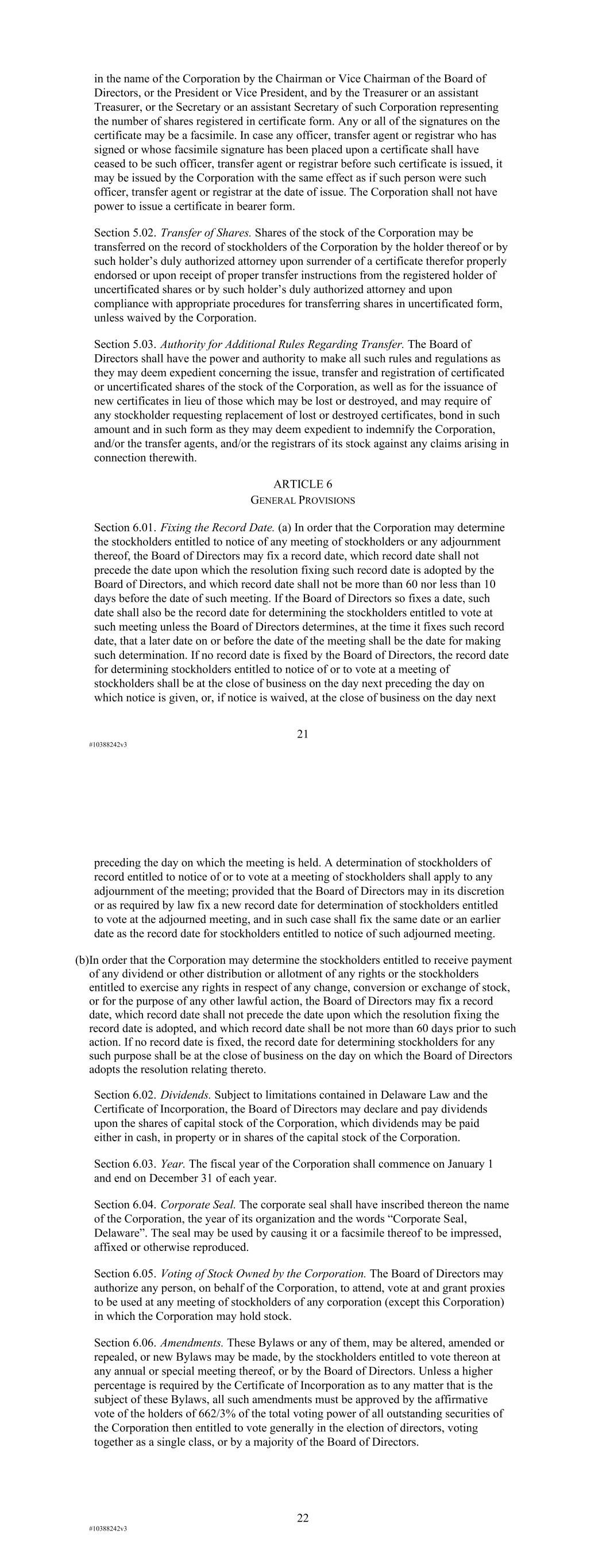 21 #10388242v3 in the name of the Corporation by the Chairman or Vice Chairman of the Board of Directors, or the President or Vice President, and by the Treasurer or an assistant Treasurer, or the Secretary or an assistant Secretary of such Corporation representing the number of shares registered in certificate form. Any or all of the signatures on the certificate may be a facsimile. In case any officer, transfer agent or registrar who has signed or whose facsimile signature has been placed upon a certificate shall have ceased to be such officer, transfer agent or registrar before such certificate is issued, it may be issued by the Corporation with the same effect as if such person were such officer, transfer agent or registrar at the date of issue. The Corporation shall not have power to issue a certificate in bearer form. Section 5.02. Transfer of Shares. Shares of the stock of the Corporation may be transferred on the record of stockholders of the Corporation by the holder thereof or by such holder’s duly authorized attorney upon surrender of a certificate therefor properly endorsed or upon receipt of proper transfer instructions from the registered holder of uncertificated shares or by such holder’s duly authorized attorney and upon compliance with appropriate procedures for transferring shares in uncertificated form, unless waived by the Corporation. Section 5.03. Authority for Additional Rules Regarding Transfer. The Board of Directors shall have the power and authority to make all such rules and regulations as they may deem expedient concerning the issue, transfer and registration of certificated or uncertificated shares of the stock of the Corporation, as well as for the issuance of new certificates in lieu of those which may be lost or destroyed, and may require of any stockholder requesting replacement of lost or destroyed certificates, bond in such amount and in such form as they may deem expedient to indemnify the Corporation, and/or the transfer agents, and/or the registrars of its stock against any claims arising in connection therewith. ARTICLE 6 GENERAL PROVISIONS Section 6.01. Fixing the Record Date. (a) In order that the Corporation may determine the stockholders entitled to notice of any meeting of stockholders or any adjournment thereof, the Board of Directors may fix a record date, which record date shall not precede the date upon which the resolution fixing such record date is adopted by the Board of Directors, and which record date shall not be more than 60 nor less than 10 days before the date of such meeting. If the Board of Directors so fixes a date, such date shall also be the record date for determining the stockholders entitled to vote at such meeting unless the Board of Directors determines, at the time it fixes such record date, that a later date on or before the date of the meeting shall be the date for making such determination. If no record date is fixed by the Board of Directors, the record date for determining stockholders entitled to notice of or to vote at a meeting of stockholders shall be at the close of business on the day next preceding the day on which notice is given, or, if notice is waived, at the close of business on the day next 22 #10388242v3 preceding the day on which the meeting is held. A determination of stockholders of record entitled to notice of or to vote at a meeting of stockholders shall apply to any adjournment of the meeting; provided that the Board of Directors may in its discretion or as required by law fix a new record date for determination of stockholders entitled to vote at the adjourned meeting, and in such case shall fix the same date or an earlier date as the record date for stockholders entitled to notice of such adjourned meeting. (b)In order that the Corporation may determine the stockholders entitled to receive payment of any dividend or other distribution or allotment of any rights or the stockholders entitled to exercise any rights in respect of any change, conversion or exchange of stock, or for the purpose of any other lawful action, the Board of Directors may fix a record date, which record date shall not precede the date upon which the resolution fixing the record date is adopted, and which record date shall be not more than 60 days prior to such action. If no record date is fixed, the record date for determining stockholders for any such purpose shall be at the close of business on the day on which the Board of Directors adopts the resolution relating thereto. Section 6.02. Dividends. Subject to limitations contained in Delaware Law and the Certificate of Incorporation, the Board of Directors may declare and pay dividends upon the shares of capital stock of the Corporation, which dividends may be paid either in cash, in property or in shares of the capital stock of the Corporation. Section 6.03. Year. The fiscal year of the Corporation shall commence on January 1 and end on December 31 of each year. Section 6.04. Corporate Seal. The corporate seal shall have inscribed thereon the name of the Corporation, the year of its organization and the words “Corporate Seal, Delaware”. The seal may be used by causing it or a facsimile thereof to be impressed, affixed or otherwise reproduced. Section 6.05. Voting of Stock Owned by the Corporation. The Board of Directors may authorize any person, on behalf of the Corporation, to attend, vote at and grant proxies to be used at any meeting of stockholders of any corporation (except this Corporation) in which the Corporation may hold stock. Section 6.06. Amendments. These Bylaws or any of them, may be altered, amended or repealed, or new Bylaws may be made, by the stockholders entitled to vote thereon at any annual or special meeting thereof, or by the Board of Directors. Unless a higher percentage is required by the Certificate of Incorporation as to any matter that is the subject of these Bylaws, all such amendments must be approved by the affirmative vote of the h