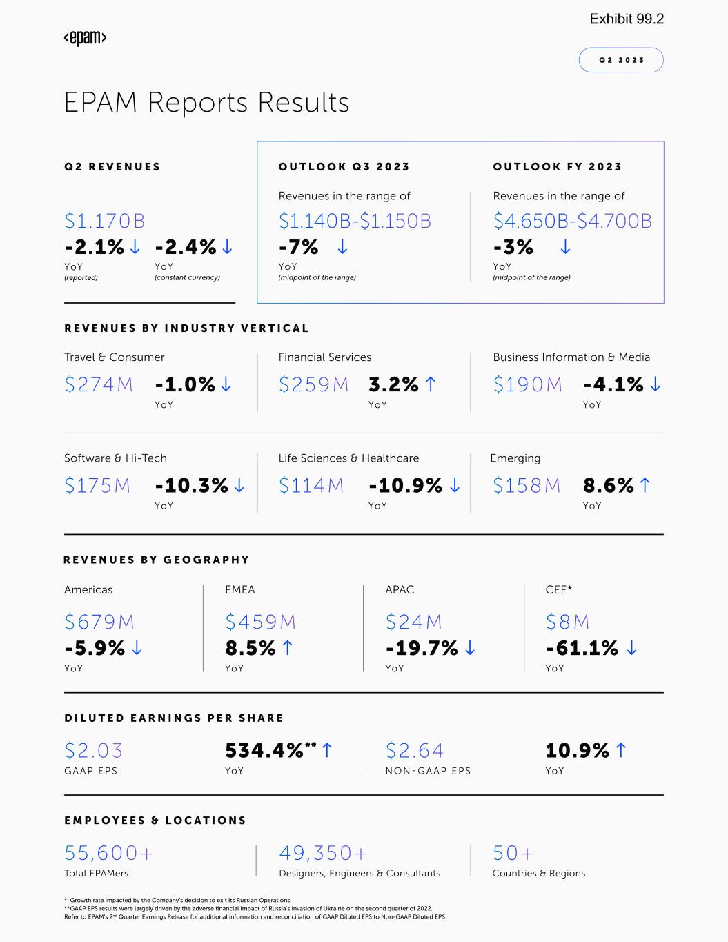 EPAM Reports Results Q 2 2 0 2 3 -7% -3% O U T L O O K Q 3 2 0 2 3 O U T L O O K F Y 2 0 2 3Q 2 R E V E N U E S YoY (reported) YoY (constant currency) $1.170B -2.1% -2.4% YoY (midpoint of the range) YoY (midpoint of the range) $1.140B-$1.150B $4.650B-$4.700B Revenues in the range of Revenues in the range of 55,600+ 49,350+ 50+ E M P L O Y E E S & L O C A T I O N S Total EPAMers Designers, Engineers & Consultants Countries & Regions $2.64534.4%** 10.9%$2.03 D I L U T E D E A R N I N G S P E R S H A R E G A A P E P S N O N-G A A P E P SYoY YoY R E V E N U E S B Y I N D U S T R Y V E R T I C A L YoY YoY -1.0% Travel & Consumer Financial Services Business Information & Media $274M 3.2%$259M $190M YoY -4.1% YoY YoY -10.3% Software & Hi-Tech Life Sciences & Healthcare Emerging $175M -10.9%$114M $158M YoY 8.6% R E V E N U E S B Y G E O G R A P H Y YoY YoY YoY YoY $679M $459M $24M $8M -5.9% 8.5% -19.7% -61.1% Americas EMEA APAC CEE* * Growth rate impacted by the Company’s decision to exit its Russian Operations. ** GAAP EPS results were largely driven by the adverse financial impact of Russia’s invasion of Ukraine on the second quarter of 2022. Refer to EPAM’s 2nd Quarter Earnings Release for additional information and reconciliation of GAAP Diluted EPS to Non-GAAP Diluted EPS. Exhibit 99.2