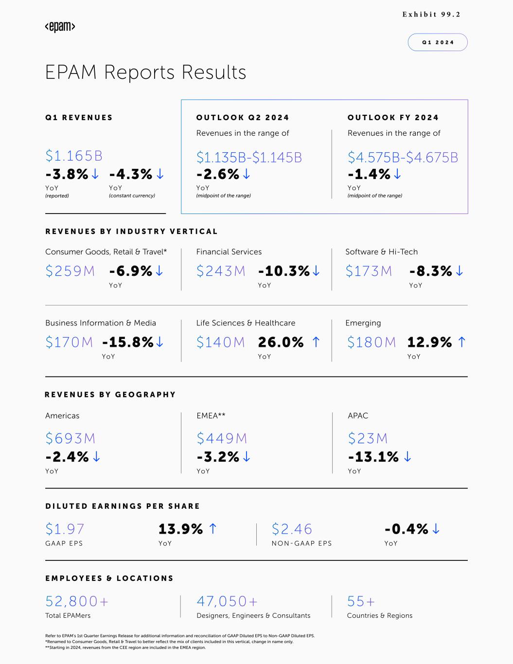 EPAM Reports Results Q 1 2 0 2 4 -2.6% -1.4% O U T L O O K Q 2 2 0 2 4Q 1 R E V E N U E S YoY (reported) YoY (constant currency) $1.165B -3.8% -4.3% YoY (midpoint of the range) YoY (midpoint of the range) $1.135B-$1.145B $4.575B-$4.675B Revenues in the range of Revenues in the range of 52,800+ 47,050+ 55+ E M P L O Y E E S & L O C A T I O N S Total EPAMers Designers, Engineers & Consultants Countries & Regions $2.4613.9% -0.4%$1.97 D I L U T E D E A R N I N G S P E R S H A R E G A A P E P S N O N-G A A P E P SYoY YoY R E V E N U E S B Y I N D U S T R Y V E R T I C A L YoY YoY -6.9% Consumer Goods, Retail & Travel* Financial Services $259M -10.3%$243M Business Information & Media $170M YoY -15.8% YoY Life Sciences & Healthcare Emerging YoY -8.3% Software & Hi-Tech $173M 26.0%$140M $180M YoY 12.9% R E V E N U E S B Y G E O G R A P H Y YoY YoY $693M $449M -2.4% -3.2% Americas EMEA** YoY $23M -13.1% APAC Refer to EPAM’s 1st Quarter Earnings Release for additional information and reconciliation of GAAP Diluted EPS to Non-GAAP Diluted EPS. * Renamed to Consumer Goods, Retail & Travel to better reflect the mix of clients included in this vertical, change in name only. ** Starting in 2024, revenues from the CEE region are included in the EMEA region. O U T L O O K F Y 2 0 2 4 E x h i b i t 9 9 . 2