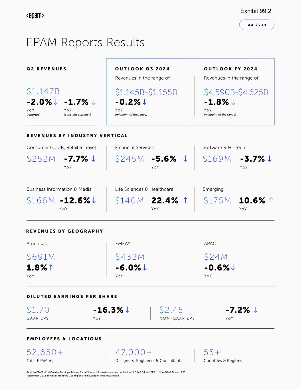EPAM Reports Results Q 2 2 0 2 4 -0.2% -1.8% O U T L O O K Q 3 2 0 2 4Q 2 R E V E N U E S YoY (reported) YoY (constant currency) $1.147B -2.0% -1.7% YoY (midpoint of the range) YoY (midpoint of the range) $1.145B-$1.155B $4.590B-$4.625B Revenues in the range of Revenues in the range of 52,650+ 47,000+ 55+ E M P L O Y E E S & L O C A T I O N S Total EPAMers Designers, Engineers & Consultants Countries & Regions $2.45-16.3% -7.2%$1.70 D I L U T E D E A R N I N G S P E R S H A R E G A A P E P S N O N-G A A P E P SYoY YoY R E V E N U E S B Y I N D U S T R Y V E R T I C A L YoY YoY -7.7% Consumer Goods, Retail & Travel Financial Services $252M -5.6%$245M Business Information & Media $166M YoY -12.6% YoY Life Sciences & Healthcare Emerging YoY -3.7% Software & Hi-Tech $169M 22.4%$140M $175M YoY 10.6% R E V E N U E S B Y G E O G R A P H Y YoY YoY $691M $432M 1.8% -6.0% Americas EMEA* YoY $24M -0.6% APAC Refer to EPAM’s 2nd Quarter Earnings Release for additional information and reconciliation of GAAP Diluted EPS to Non-GAAP Diluted EPS. * Starting in 2024, revenues from the CEE region are included in the EMEA region. O U T L O O K F Y 2 0 2 4 Exhibit 99.2