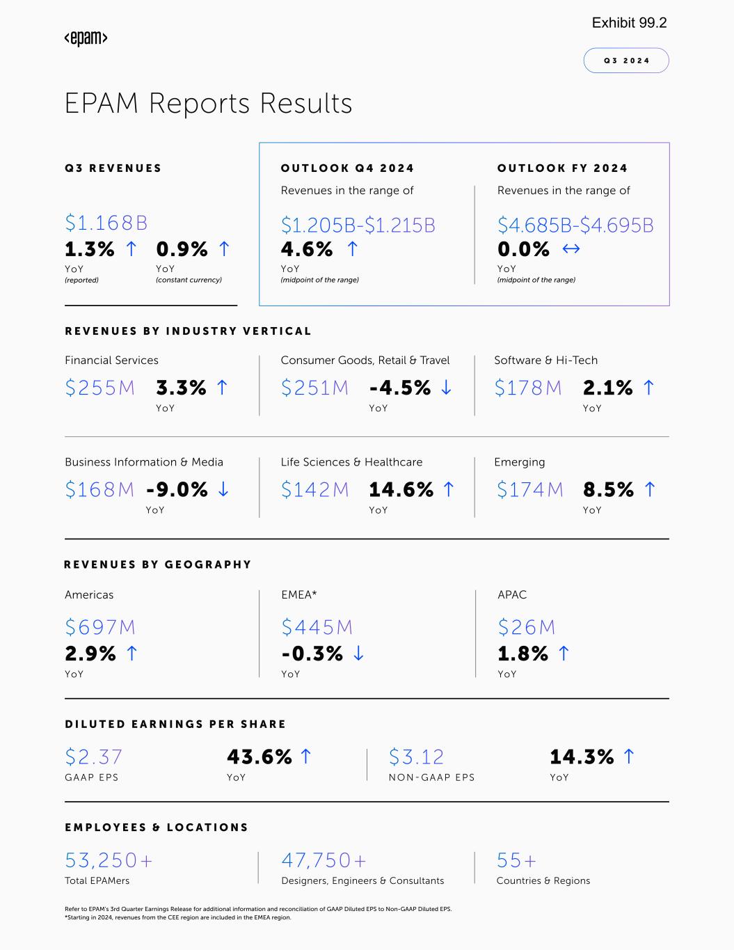 EPAM Reports Results Q 3 2 0 2 4 4.6% 0.0% O U T L O O K Q 4 2 0 2 4Q 3 R E V E N U E S YoY (reported) YoY (constant currency) $1.168B 1.3% 0.9% YoY (midpoint of the range) YoY (midpoint of the range) $1.205B-$1.215B $4.685B-$4.695B Revenues in the range of Revenues in the range of 53,250+ 47,750+ 55+ E M P L O Y E E S & L O C A T I O N S Total EPAMers Designers, Engineers & Consultants Countries & Regions $3.1243.6% 14.3%$2.37 D I L U T E D E A R N I N G S P E R S H A R E G A A P E P S N O N-G A A P E P SYoY YoY R E V E N U E S B Y I N D U S T R Y V E R T I C A L YoY YoY 3.3% Financial Services Consumer Goods, Retail & Travel $255M -4.5%$251M Business Information & Media $168M YoY -9.0% YoY Life Sciences & Healthcare Emerging YoY 2.1% Software & Hi-Tech $178M 14.6%$142M $174M YoY 8.5% R E V E N U E S B Y G E O G R A P H Y YoY YoY $697M $445M 2.9% -0.3% Americas EMEA* YoY $26M 1.8% APAC Refer to EPAM’s 3rd Quarter Earnings Release for additional information and reconciliation of GAAP Diluted EPS to Non-GAAP Diluted EPS. * Starting in 2024, revenues from the CEE region are included in the EMEA region. O U T L O O K F Y 2 0 2 4 Exhibit 99.2