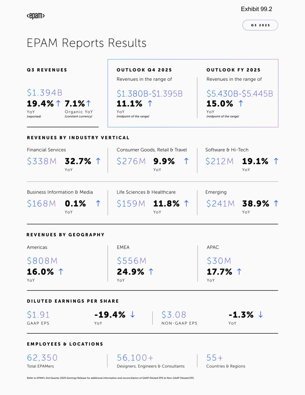 EPAM Reports Results Q 3 2 0 2 5 11.1% 15.0% O U T L O O K Q 4 2 0 2 5 O U T L O O K F Y 2 0 2 5Q 3 R E V E N U E S YoY (reported) O r g a n i c YoY (constant currency) $1.394B 19.4% 7.1% YoY (midpoint of the range) YoY (midpoint of the range) $1.380B-$1.395B $5.430B-$5.445B Revenues in the range of Revenues in the range of 62,350 56,100+ 55+ E M P L O Y E E S & L O C A T I O N S Total EPAMers Designers, Engineers & Consultants Countries & Regions $3.08-19.4% -1.3%$1.91 D I L U T E D E A R N I N G S P E R S H A R E G A A P E P S N O N-G A A P E P SYoY YoY R E V E N U E S B Y I N D U S T R Y V E R T I C A L YoY YoY 32.7% Financial Services Consumer Goods, Retail & Travel $338M 9.9%$276M Business Information & Media $168M YoY 0.1% YoY Life Sciences & Healthcare Emerging YoY 19.1% Software & Hi-Tech $212M 11.8%$159M $241M YoY 38.9% R E V E N U E S B Y G E O G R A P H Y YoY YoY $808M $556M 16.0% 24.9% Americas EMEA YoY $30M 17.7% APAC Refer to EPAM’s 3rd Quarter 2025 Earnings Release for additional information and reconciliation of GAAP Diluted EPS to Non-GAAP Diluted EPS. Exhibit 99.2