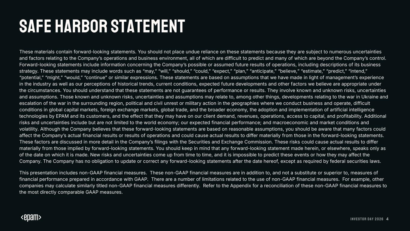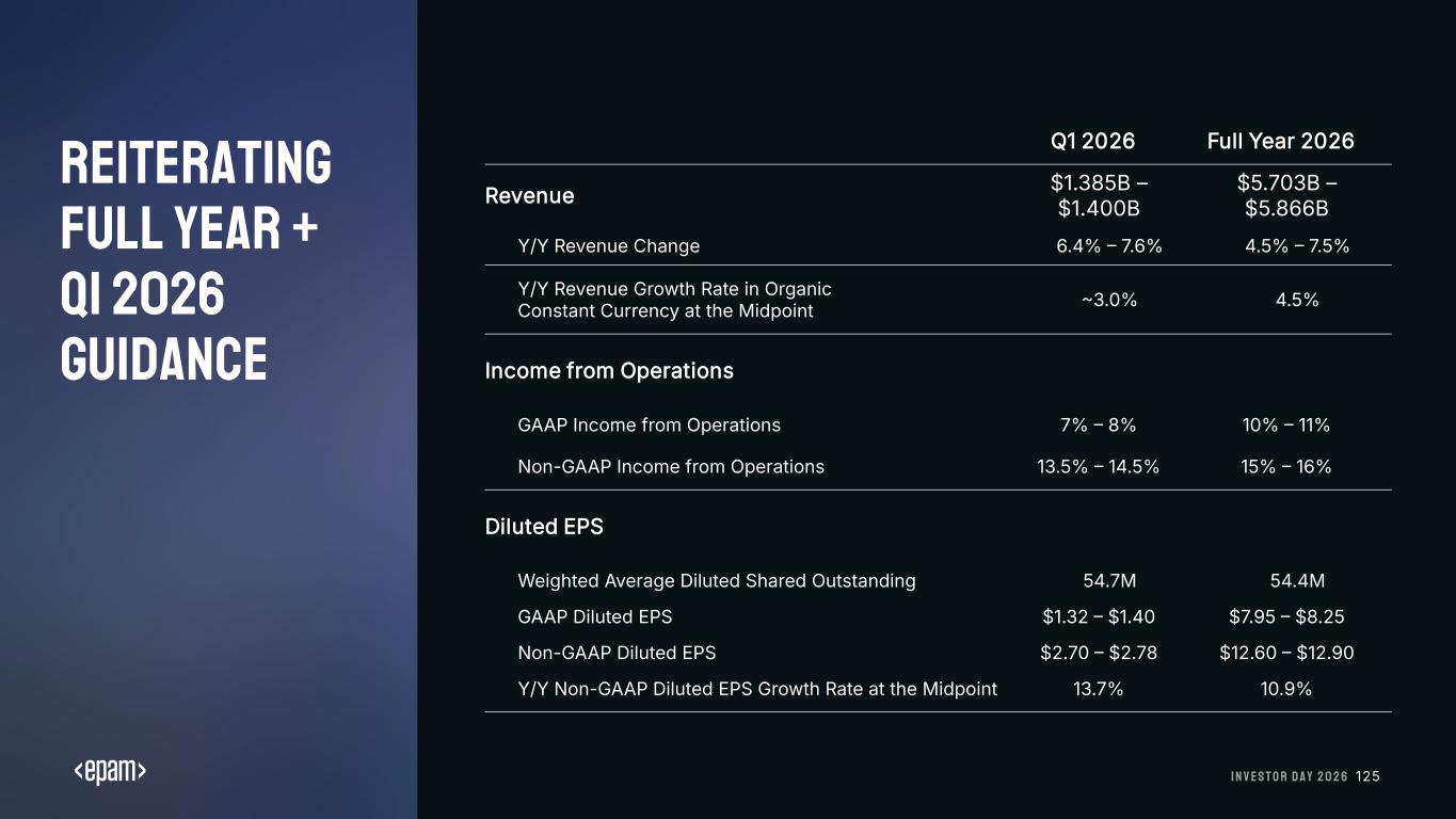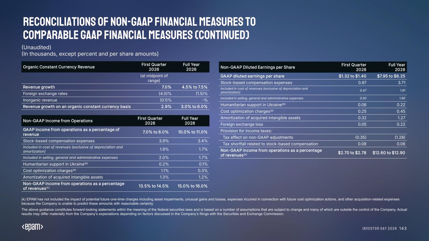 143 Reconciliations of Non-GAAP Financial Measures to Comparable GAAP Financial Measures (continued) (Unaudited) (In thousands, except percent and per share amounts) Organic Constant Currency Revenue First Quarter 2026 Full Year 2026 (at midpoint of range) Revenue growth 7.0% 4.5% to 7.5% Foreign exchange rates (4.0)% (1.5)% Inorganic revenue (0.1)% -% Revenue growth on an organic constant currency basis 2.9% 3.0% to 6.0% Non-GAAP Income from Operations First Quarter 2026 Full Year 2026 GAAP income from operations as a percentage of revenue 7.0% to 8.0% 10.0% to 11.0% Stock-based compensation expenses 3.9% 3.4% Included in cost of revenues (exclusive of depreciation and amortization) 1.9% 1.7% Included in selling, general and administrative expenses 2.0% 1.7% Humanitarian support in Ukraine(b) 0.2% 0.1% Cost optimization charges(e) 1.1% 0.3% Amortization of acquired intangible assets 1.3% 1.2% Non-GAAP income from operations as a percentage of revenues(k) 13.5% to 14.5% 15.0% to 16.0% Non-GAAP Diluted Earnings per Share First Quarter 2026 Full Year 2026 GAAP diluted earnings per share $1.32 to $1.40 $7.95 to $8.25 Stock-based compensation expenses 0.97 3.71 Included in cost of revenues (exclusive of depreciation and amortization) 0.47 1.81 Included in selling, general and administrative expenses 0.50 1.90 Humanitarian support in Ukraine(b) 0.06 0.22 Cost optimization charges(e) 0.25 0.45 Amortization of acquired intangible assets 0.32 1.27 Foreign exchange loss 0.05 0.22 Provision for income taxes: Tax effect on non-GAAP adjustments (0.35) (1.28) Tax shortfall related to stock-based compensation 0.08 0.06 Non-GAAP income from operations as a percentage of revenues(k) $2.70 to $2.78 $12.60 to $12.90 (k) EPAM has not included the impact of potential future one-time charges including asset impairments, unusual gains and losses, expenses incurred in connection with future cost optimization actions, and other acquisition-related expenses because the Company is unable to predict these amounts with reasonable certainty. The above guidance constitutes forward-looking statements within the meaning of the federal securities laws and is based on a number of assumptions that are subject to change and many of which are outside the control of the Company. Actual results may differ materially from the Company’s expectations depending on factors discussed in the Company’s filings with the Securities and Exchange Commission.