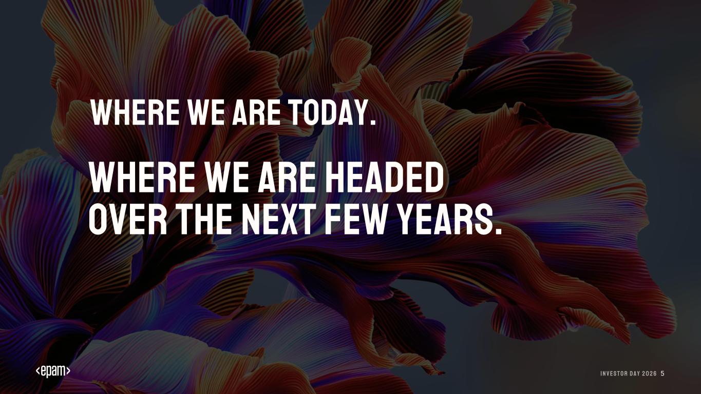 Safe harbor statement 4 These materials contain forward-looking statements. You should not place undue reliance on these statements because they are subject to numerous uncertainties and factors relating to the Company’s operations and business environment, all of which are difficult to predict and many of which are beyond the Company’s control. Forward-looking statements include information concerning the Company’s possible or assumed future results of operations, including descriptions of its business strategy. These statements may include words such as “may,” “will,” “should,” “could,” “expect,” “plan,” “anticipate,” “believe,” “estimate,” “predict,” “intend,” “potential,” “might,” “would,” “continue” or similar expressions. These statements are based on assumptions that we have made in light of management’s experience in the industry as well as our perceptions of historical trends, current conditions, expected future developments and other factors we believe are appropriate under the circumstances. You should understand that these statements are not guarantees of performance or results. They involve known and unknown risks, uncertainties and assumptions. Those known and unknown risks, uncertainties and assumptions may relate to, among other things, developments relating to the war in Ukraine and escalation of the war in the surrounding region, political and civil unrest or military action in the geographies where we conduct business and operate, difficult conditions in global capital markets, foreign exchange markets, global trade, and the broader economy, the adoption and implementation of artificial intelligence technologies by EPAM and its customers, and the effect that they may have on our client demand, revenues, operations, access to capital, and profitability. Additional risks and uncertainties include but are not limited to the world economy; our expected financial performance; and macroeconomic and market conditions and volatility. Although the Company believes that these forward-looking statements are based on reasonable assumptions, you should be aware that many factors could affect the Company’s actual financial results or results of operations and could cause actual results to differ materially from those in the forward-looking statements. These factors are discussed in more detail in the Company’s filings with the Securities and Exchange Commission. These risks could cause actual results to differ materially from those implied by forward-looking statements. You should keep in mind that any forward-looking statement made herein, or elsewhere, speaks only as of the date on which it is made. New risks and uncertainties come up from time to time, and it is impossible to predict these events or how they may affect the Company. The Company has no obligation to update or correct any forward-looking statements after the date hereof, except as required by federal securities laws. This presentation includes non-GAAP financial measures. These non-GAAP financial measures are in addition to, and not a substitute or superior to, measures of financial performance prepared in accordance with GAAP. There are a number of limitations related to the use of non-GAAP financial measures. For example, other companies may calculate similarly titled non-GAAP financial measures differently. Refer to the Appendix for a reconciliation of these non-GAAP financial measures to the most directly comparable GAAP measures.