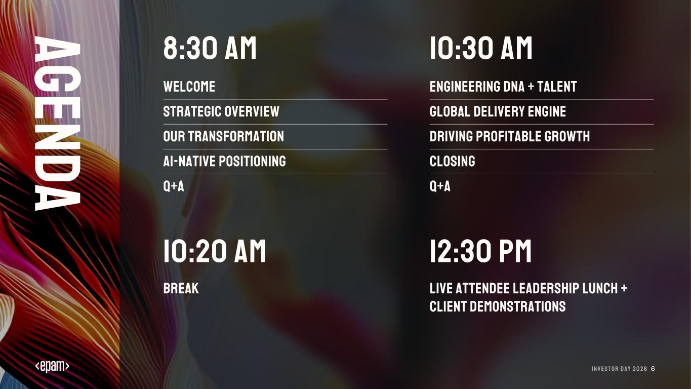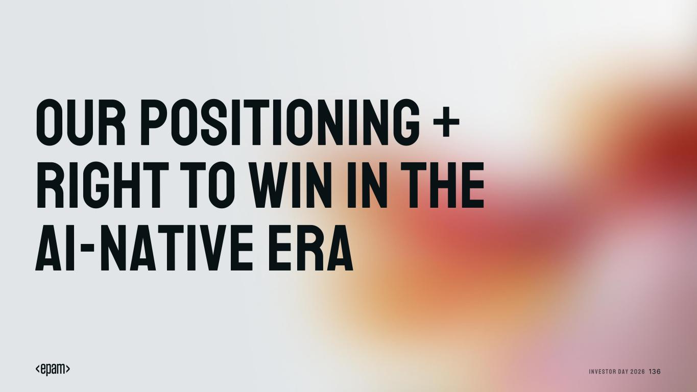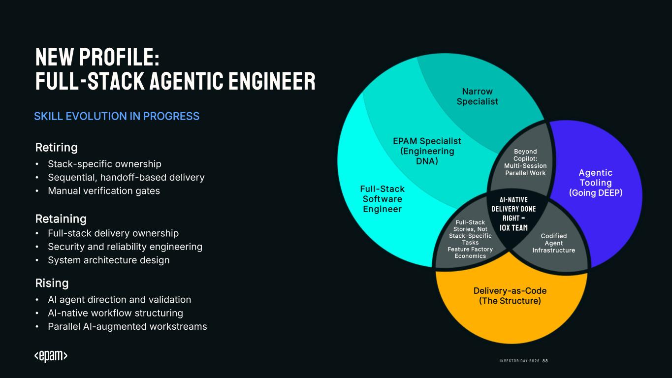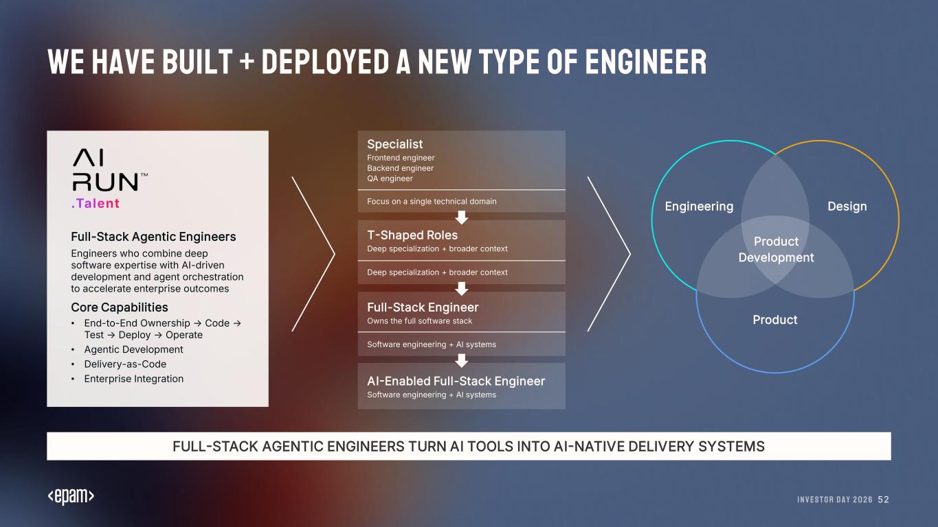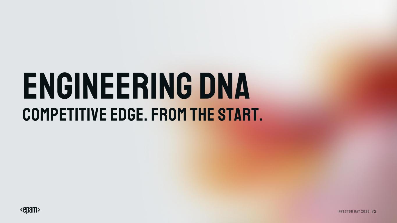 OUR Engineering Depth Is the Moat, AI Makes It Wider Why Most Companies Can’t Assemble Both Operating Delivery-as-Code & Scaling Full-Stack Agentic Engineers to Run it Requires Two Things Cost-arbitrage Firms have delivery volume, but talent built for narrow specialization — not the systems thinkers who design specs and judge agent output in complex environments Strategy + Advisory Firms have intellectual depth but lack product-building muscle and delivery footprint — can't architect agent ecosystems or harden Product Companies have strong engineering culture but built around their own product — not dozens of systems a typical enterprise client actually runs Engineering Culture + Talent DENSITY Strong engineering talent as the starting point — not an upskilling program 01 Delivery Volume Fortune 2000 engagements where the pipeline meets real compliance, security and technology constraints 02 47 AI ENGINEERING IS LEARNED BY DOING: CULTURE + VOLUME = EPAM MOAT THAT WIDENS WITH EVERY ENGAGEMENT