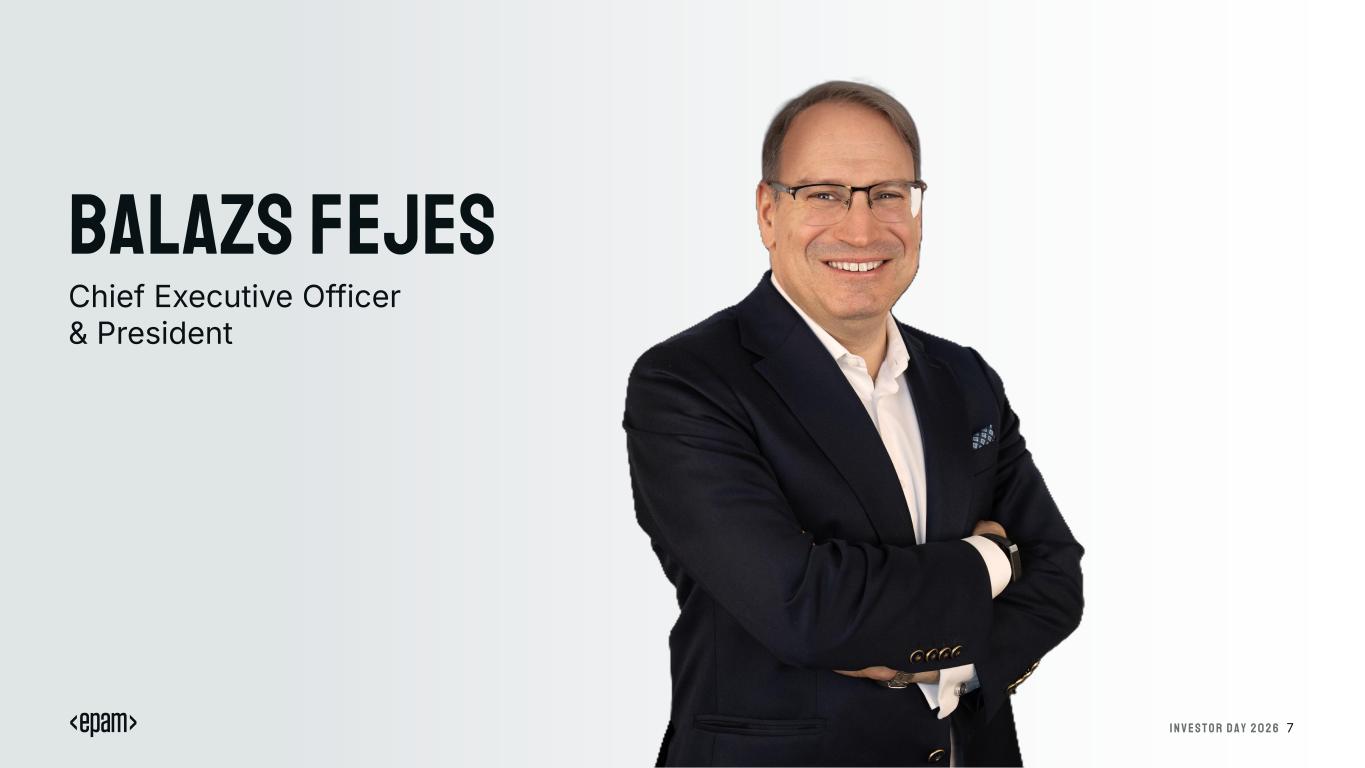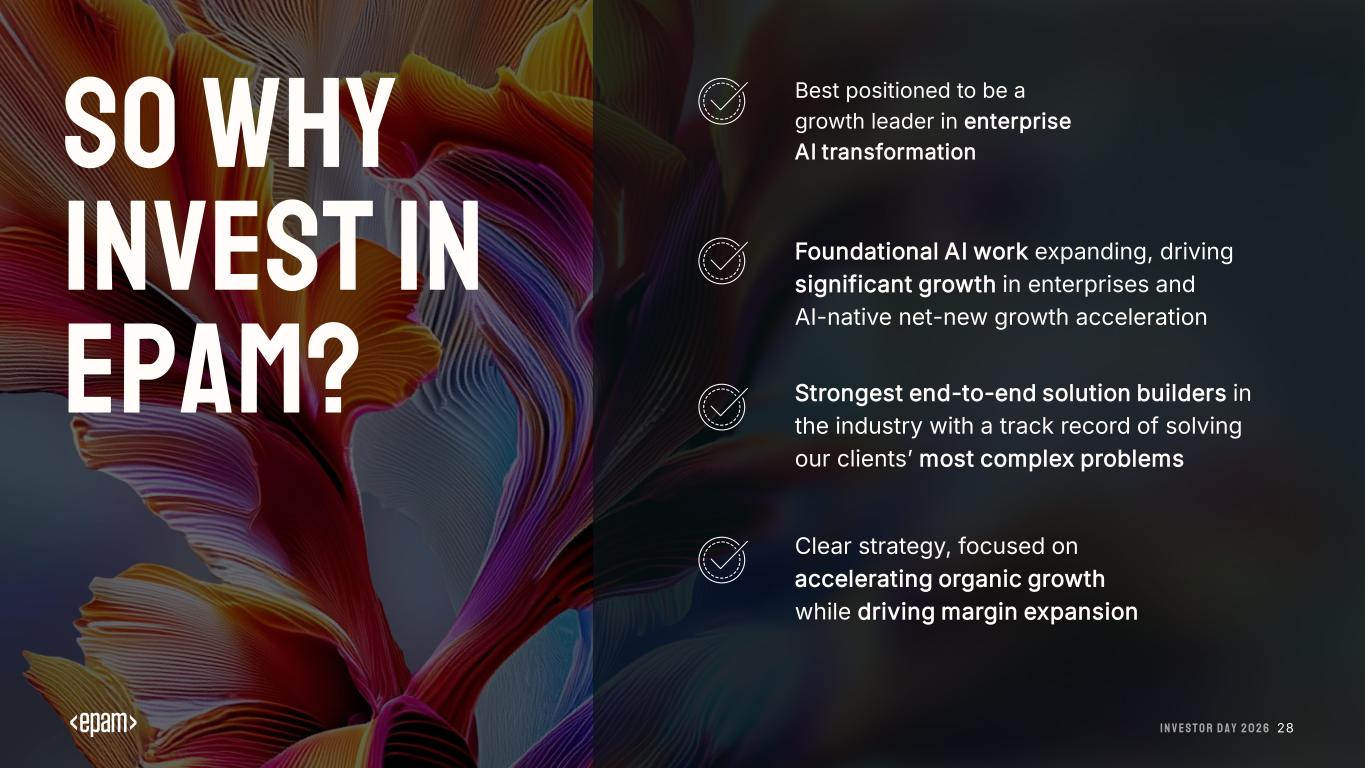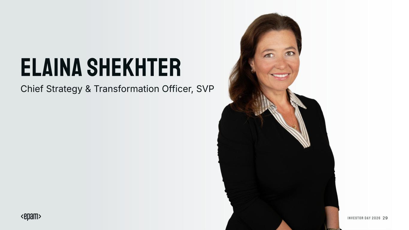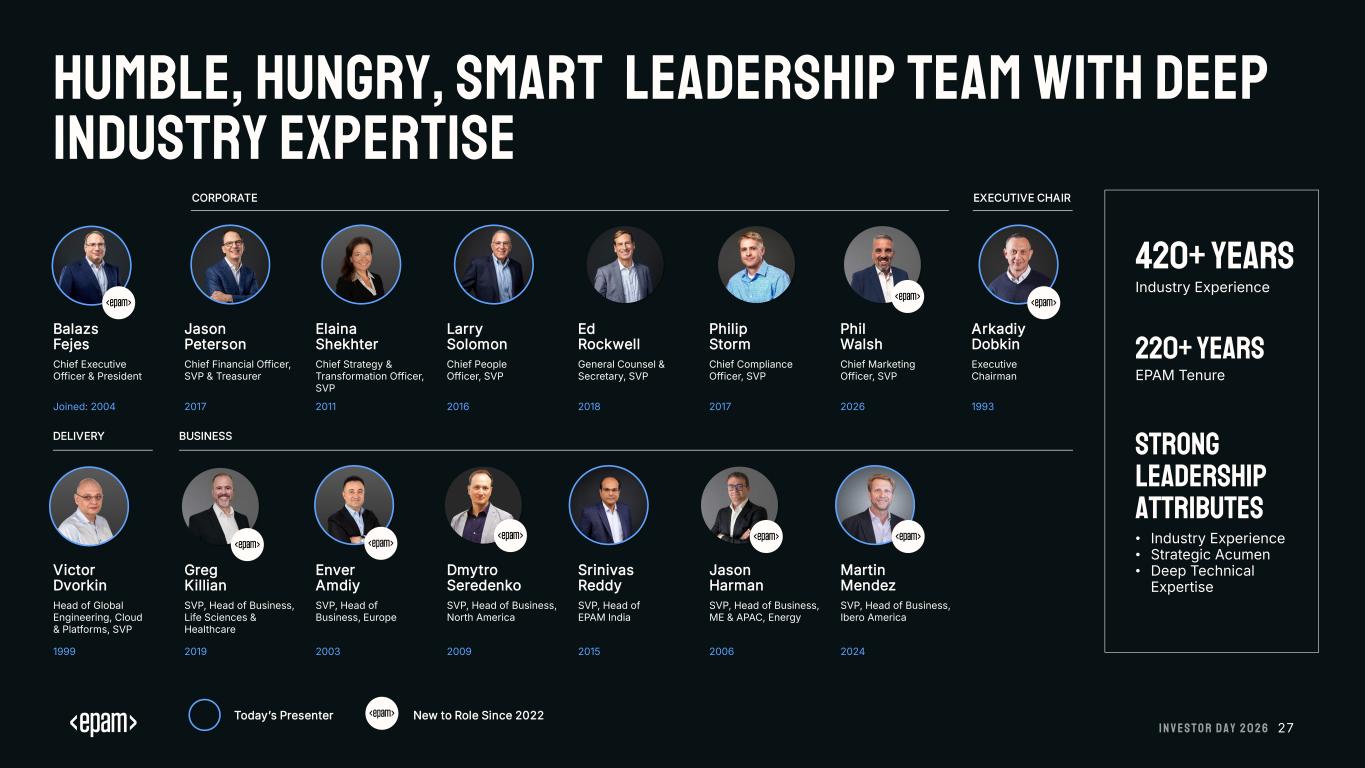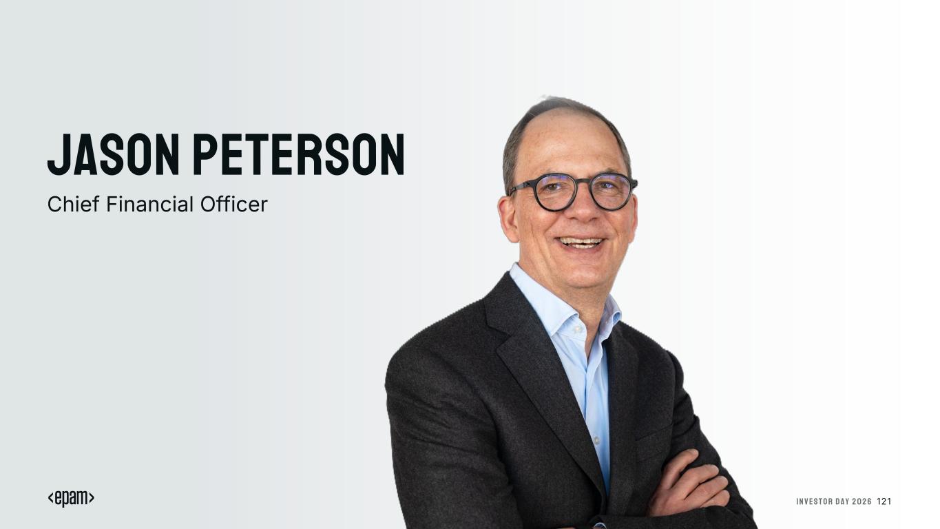 Humble, Hungry, Smart Leadership Team with Deep Industry Expertise 420+ Years Industry Experience 220+ Years EPAM Tenure Strong Leadership Attributes • Industry Experience • Strategic Acumen • Deep Technical Expertise Balazs Fejes Jason Peterson Elaina Shekhter Larry Solomon Ed Rockwell Philip Storm Phil Walsh Arkadiy Dobkin Chief Executive Officer & President Chief Financial Officer, SVP & Treasurer Chief Strategy & Transformation Officer, SVP Chief People Officer, SVP General Counsel & Secretary, SVP Chief Compliance Officer, SVP Chief Marketing Officer, SVP Executive Chairman Joined: 2004 2017 2011 2016 2018 2017 2026 1993 Victor Dvorkin Greg Killian Enver Amdiy Dmytro Seredenko Srinivas Reddy Jason Harman Martin Mendez Head of Global Engineering, Cloud & Platforms, SVP SVP, Head of Business, Life Sciences & Healthcare SVP, Head of Business, Europe SVP, Head of Business, North America SVP, Head of EPAM India SVP, Head of Business, ME & APAC, Energy SVP, Head of Business, Ibero America 1999 2019 2003 2009 2015 2006 2024 Today’s Presenter New to Role Since 2022 CORPORATE BUSINESS EXECUTIVE CHAIR DELIVERY 27