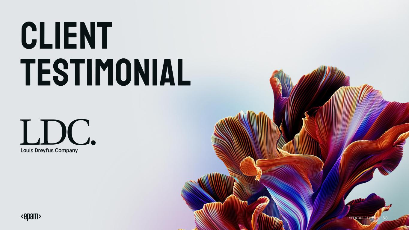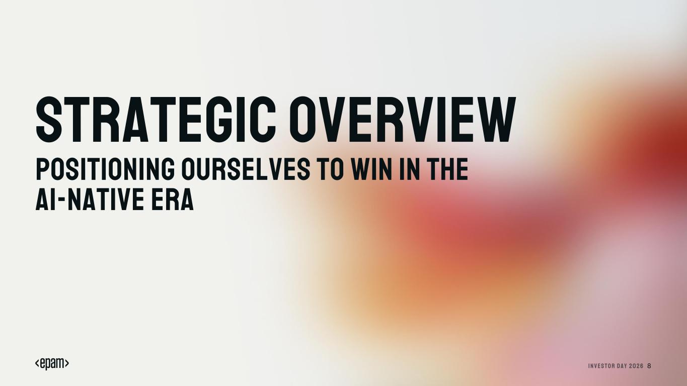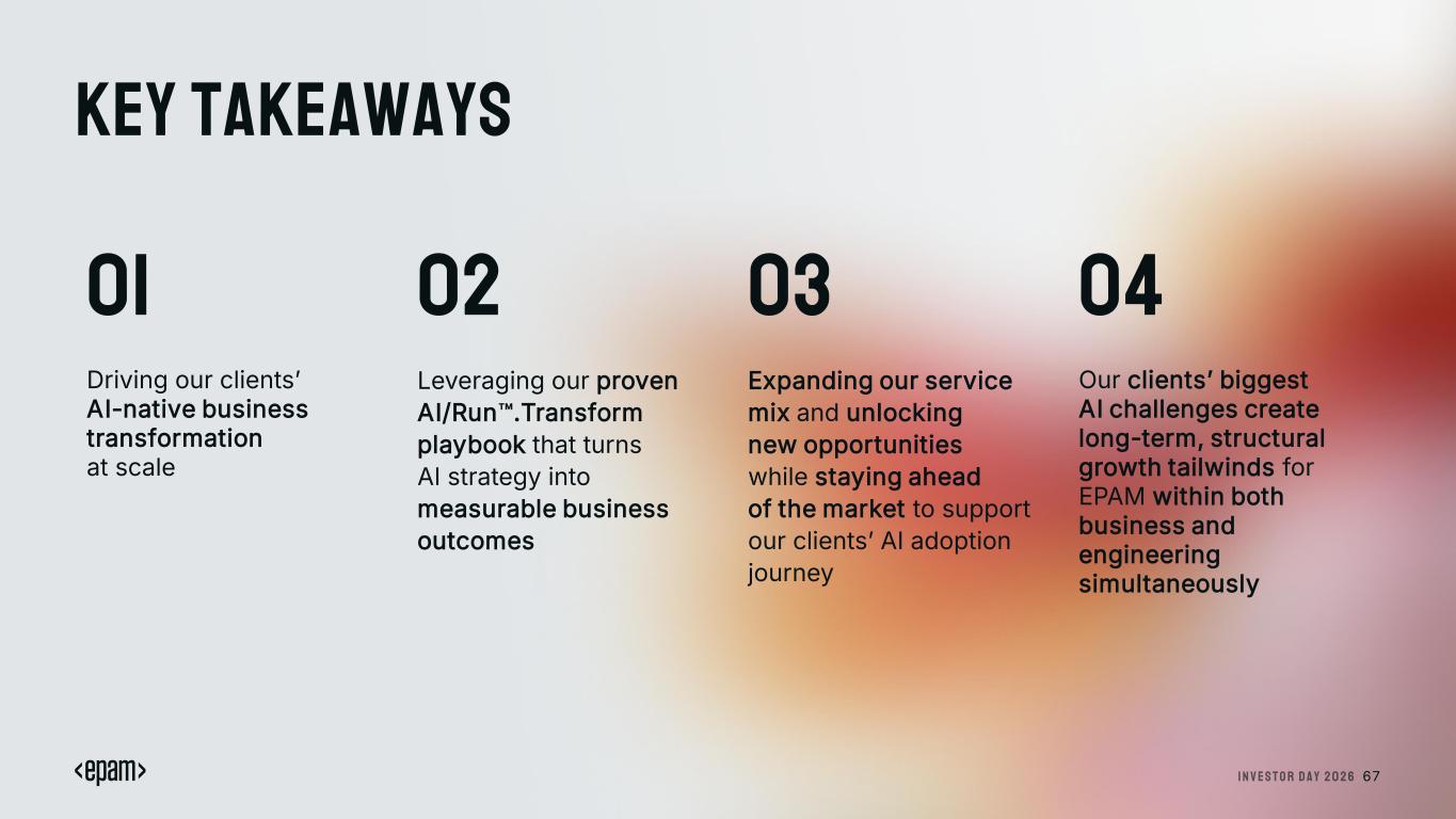 Key takeaways 01 02 03 04 Driving our clients’ AI-native business transformation at scale Leveraging our proven AI/Run .Transform playbook that turns AI strategy into measurable business outcomes Our clients’ biggest AI challenges create long-term, structural growth tailwinds for EPAM within both business and engineering simultaneously Expanding our service mix and unlocking new opportunities while staying ahead of the market to support our clients’ AI adoption journey 67