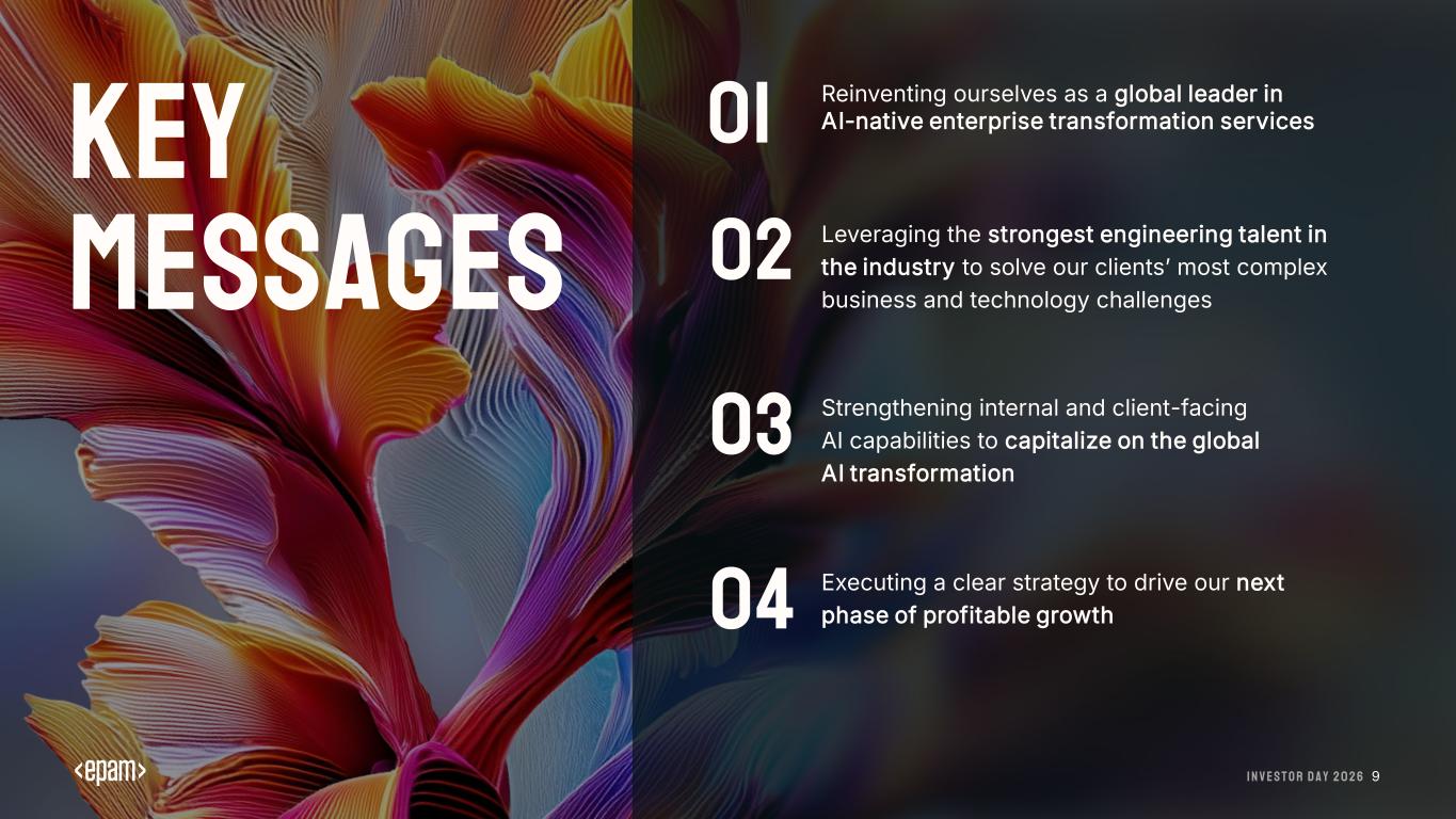 Key messages Reinventing ourselves as a global leader in AI-native enterprise transformation services01 02 Leveraging the strongest engineering talent in the industry to solve our clients’ most complex business and technology challenges 03 Strengthening internal and client-facing AI capabilities to capitalize on the global AI transformation 04 Executing a clear strategy to drive our next phase of profitable growth 9