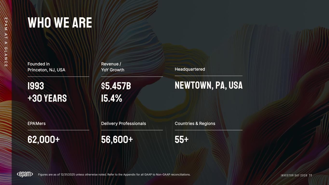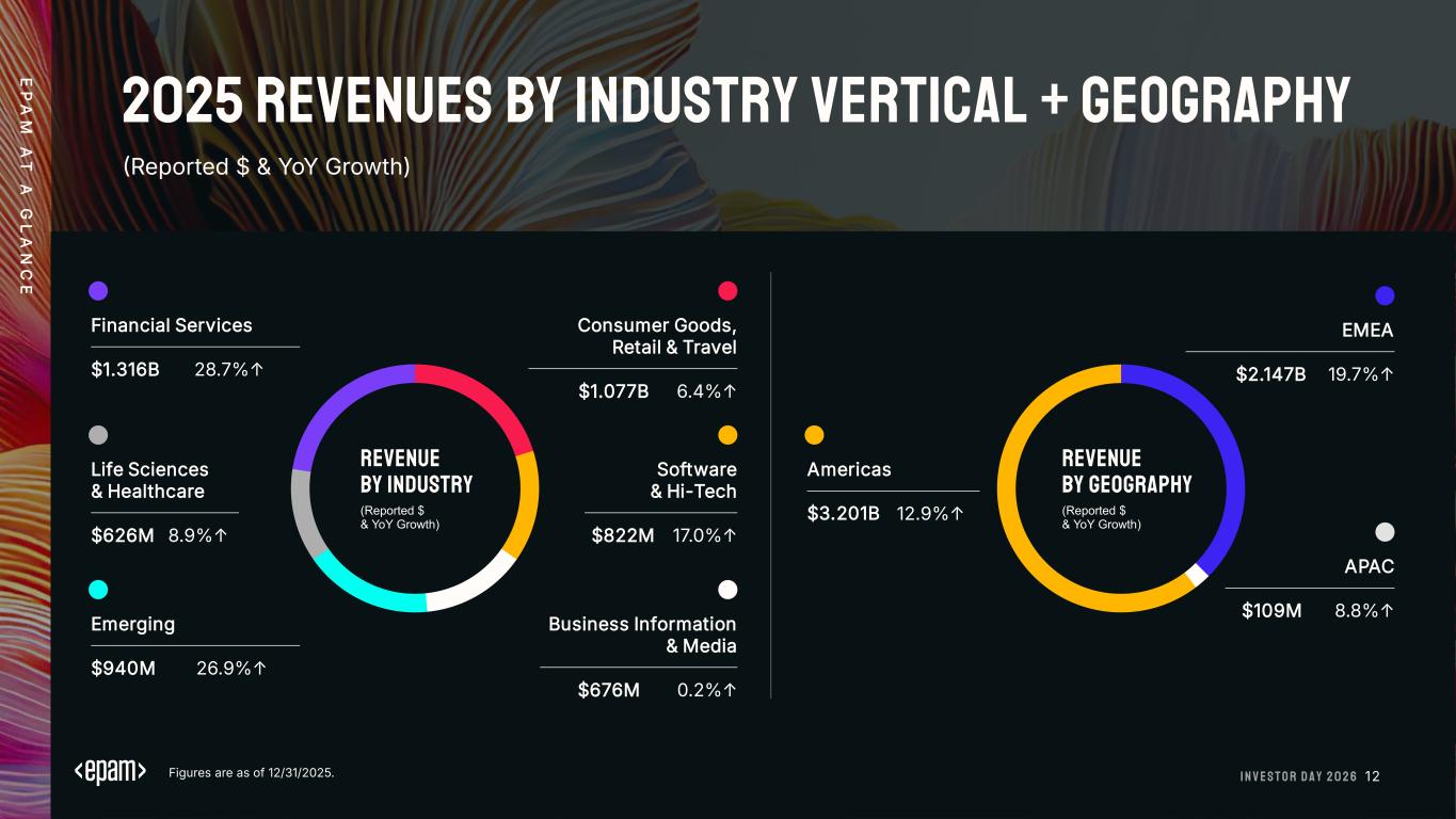 E P A M A T A G L A N C E WHO We ARE Founded in Princeton, NJ, USA 1993 +30 YEARS EPAMers 62,000+ Headquartered Newtown, PA, USA Countries & Regions 55+ Delivery Professionals 56,600+ Revenue / YoY Growth $5.457B 15.4% 11Figures are as of 12/31/2025 unless otherwise noted. Refer to the Appendix for all GAAP to Non-GAAP reconciliations.