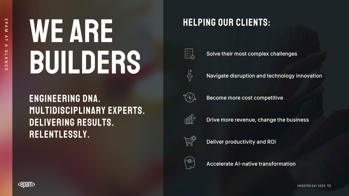 E P A M A T A G L A N C E 2025 Revenues by industry vertical + geography (Reported $ & YoY Growth) 12 E P A M A T A G L A N C E Revenue by Industry (Reported $ & YoY Growth) Financial Services $1.316B 28.7%↑ Life Sciences & Healthcare $626M 8.9%↑ Consumer Goods, Retail & Travel $1.077B 6.4%↑ Emerging $940M 26.9%↑ Software & Hi-Tech $822M 17.0%↑ Business Information & Media $676M 0.2%↑ Americas $3.201B 12.9%↑ Revenue by Geography (Reported $ & YoY Growth) EMEA $2.147B 19.7%↑ APAC $109M 8.8%↑ Figures are as of 12/31/2025.