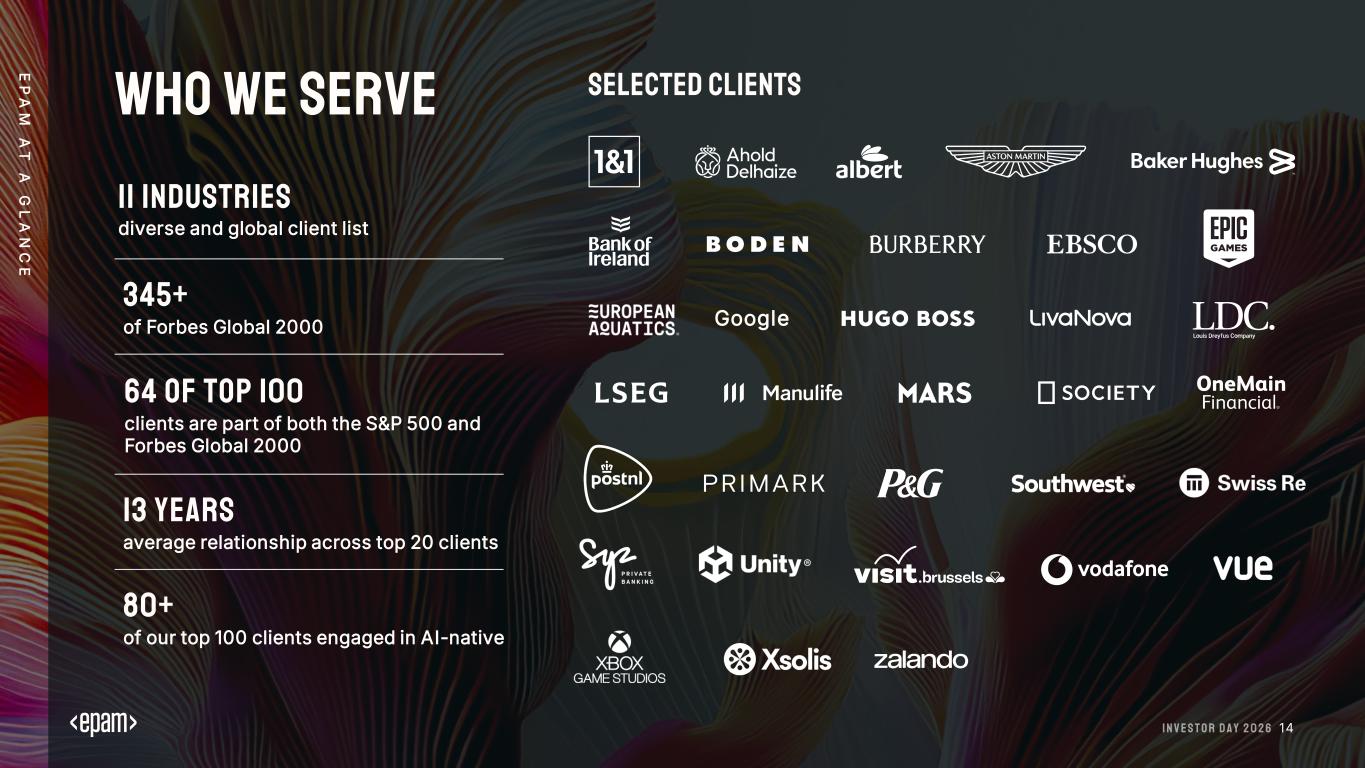 E P A M A T A G L A N C E 13 We are builders Engineering DNA. Multidisciplinary Experts. Delivering Results. Relentlessly. Solve their most complex challenges Navigate disruption and technology innovation Become more cost competitive Helping our clients: Drive more revenue, change the business Deliver productivity and ROI Accelerate AI-native transformation