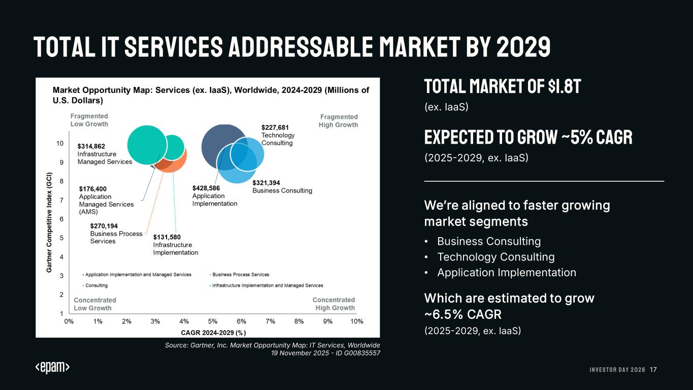 Proven by our 2025 AI-native and AI foundational momentum EPAM IS ALREADY Benefiting FROM AI Close the Adoption Gap with Scalable Expertise Labor arbitrage moves to FDE and senior talent, enabling growth without linear headcount increases Physical AI Robotics across multiple sectors Delivery Efficiency Automation and agentic AI improve productivity and reduce cost-to- serve; create new engagement models Modernization with AI Scaling will require significant modernization of legacy technology and data platforms Sovereign AI AI governance, security, responsible frameworks for compliance 16