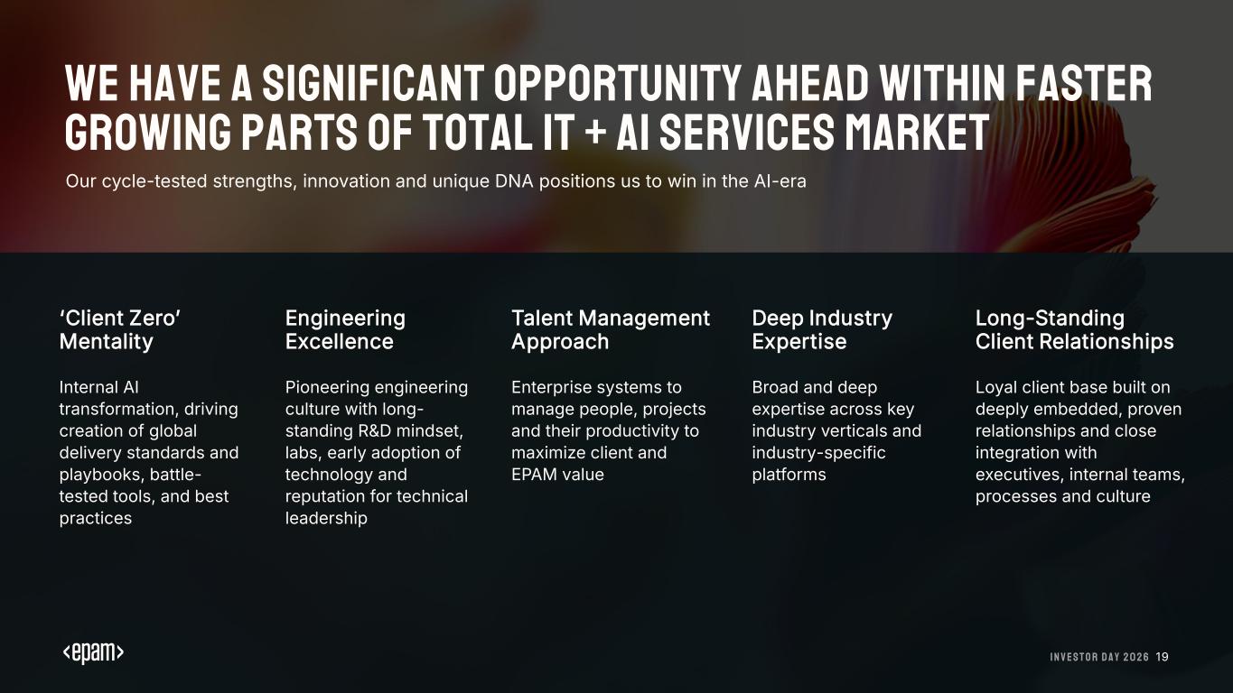 Source: Gartner, Inc. Forecast Analysis: AI Spending, 4Q25 – 17 December 2025 - ID G00843701 Total market of $4.7T (All Segments, AI Direct + AI Indirect) +30% CAGR (2025–2029) EPAM’s AI Services Market of $1.3T (AI Services + AI Cybersecurity) Most significant opportunities • Direct AI Services, ~$300B to +$500B • Indirect AI Services, ~$150B to ~$600B • AI Cybersecurity, ~$25B to +$150B • Current estimates ranging from strong to very strong double-digit CAGR 18 Total AI Spending addressable market by 2029