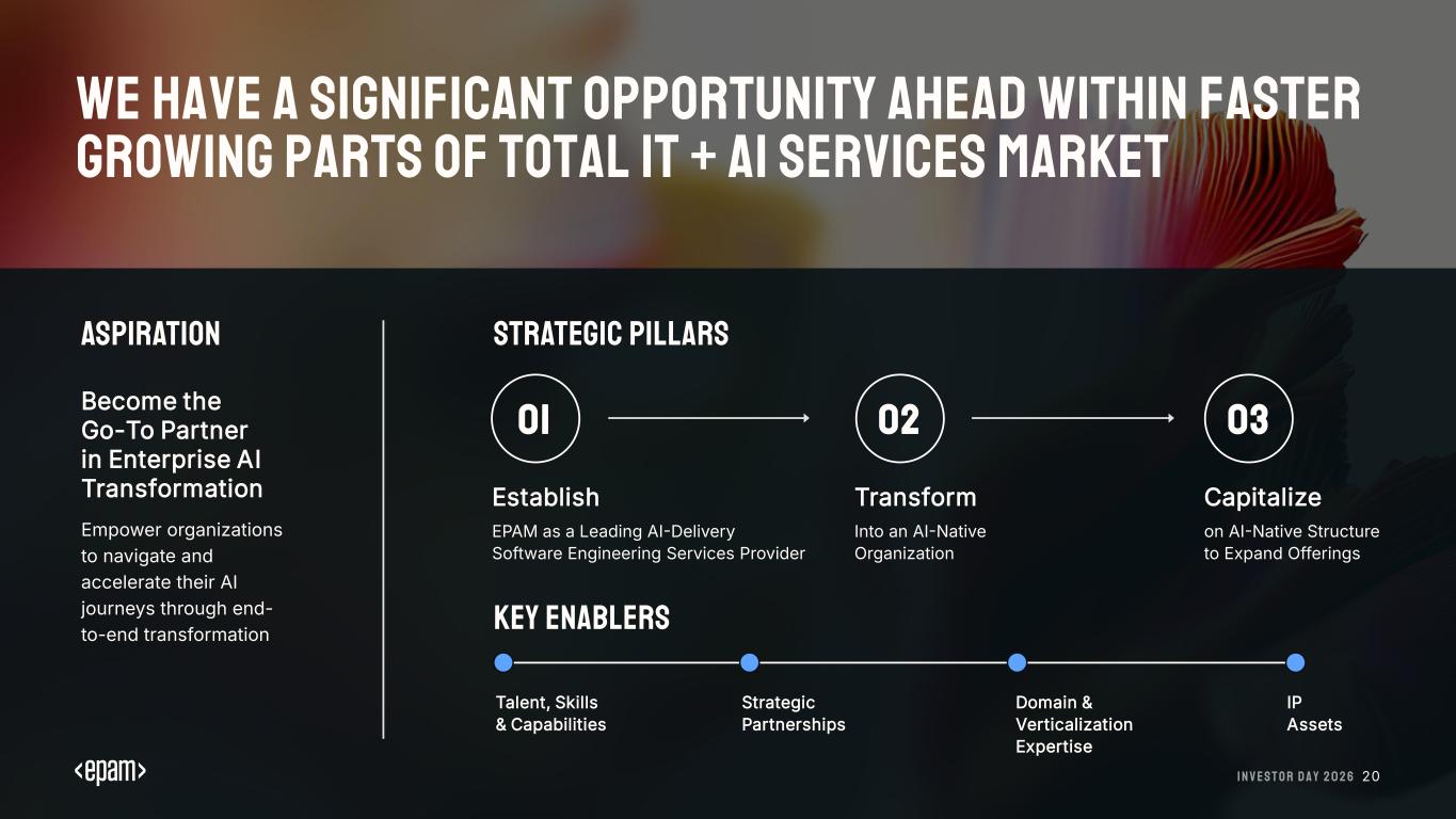 ‘Client Zero’ Mentality Internal AI transformation, driving creation of global delivery standards and playbooks, battle- tested tools, and best practices Engineering Excellence Pioneering engineering culture with long- standing R&D mindset, labs, early adoption of technology and reputation for technical leadership Talent Management Approach Enterprise systems to manage people, projects and their productivity to maximize client and EPAM value Deep Industry Expertise Broad and deep expertise across key industry verticals and industry-specific platforms Long-Standing Client Relationships Loyal client base built on deeply embedded, proven relationships and close integration with executives, internal teams, processes and culture we have a significant opportunity ahead within faster growing parts of Total IT + AI services market Our cycle-tested strengths, innovation and unique DNA positions us to win in the AI-era 19