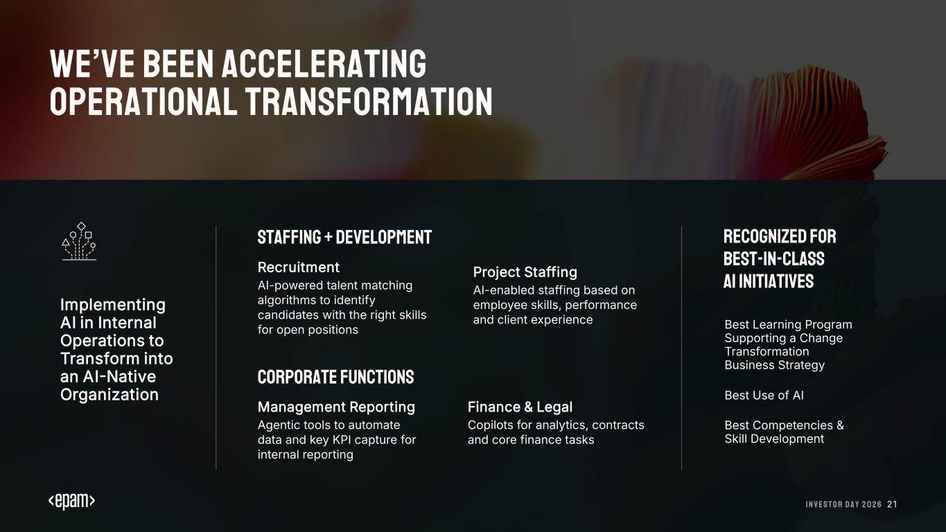 we have a significant opportunity ahead within faster growing parts of Total IT + AI services market 20 Become the Go-To Partner in Enterprise AI Transformation Empower organizations to navigate and accelerate their AI journeys through end- to-end transformation ASPIRATION Talent, Skills & Capabilities Strategic Partnerships Domain & Verticalization Expertise IP Assets KEY ENABLERS STRATEGIC PILLARS Establish EPAM as a Leading AI-Delivery Software Engineering Services Provider 01 02 03 Transform Into an AI-Native Organization Capitalize on AI-Native Structure to Expand Offerings