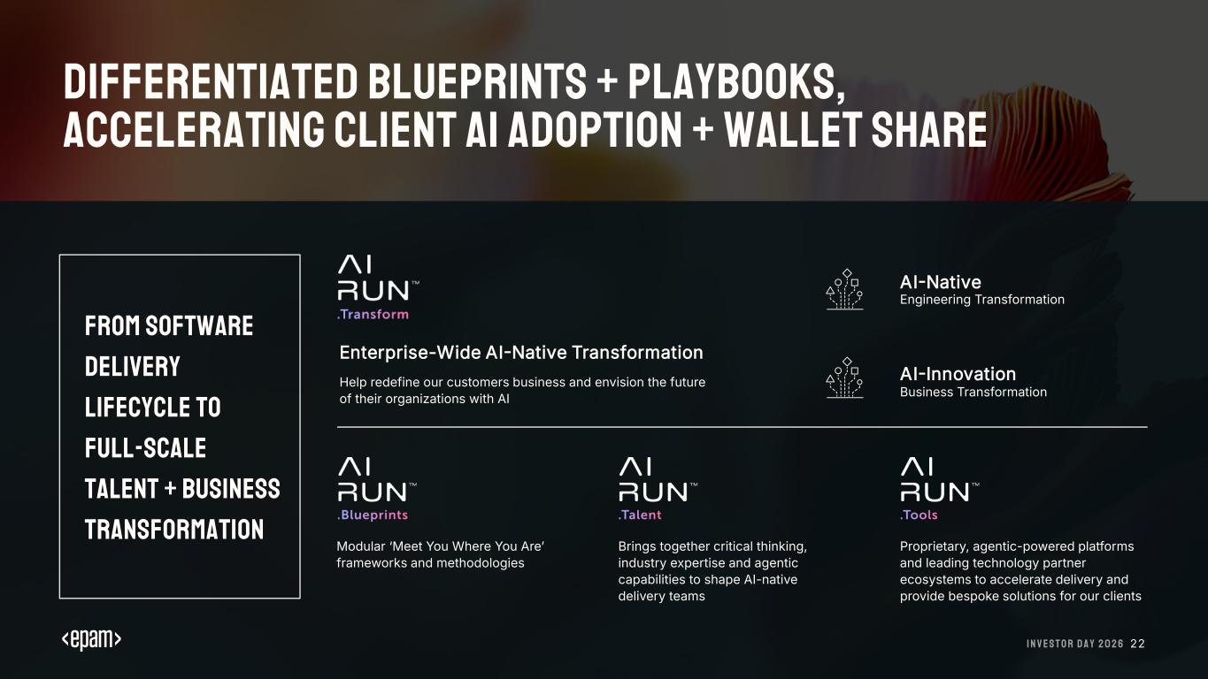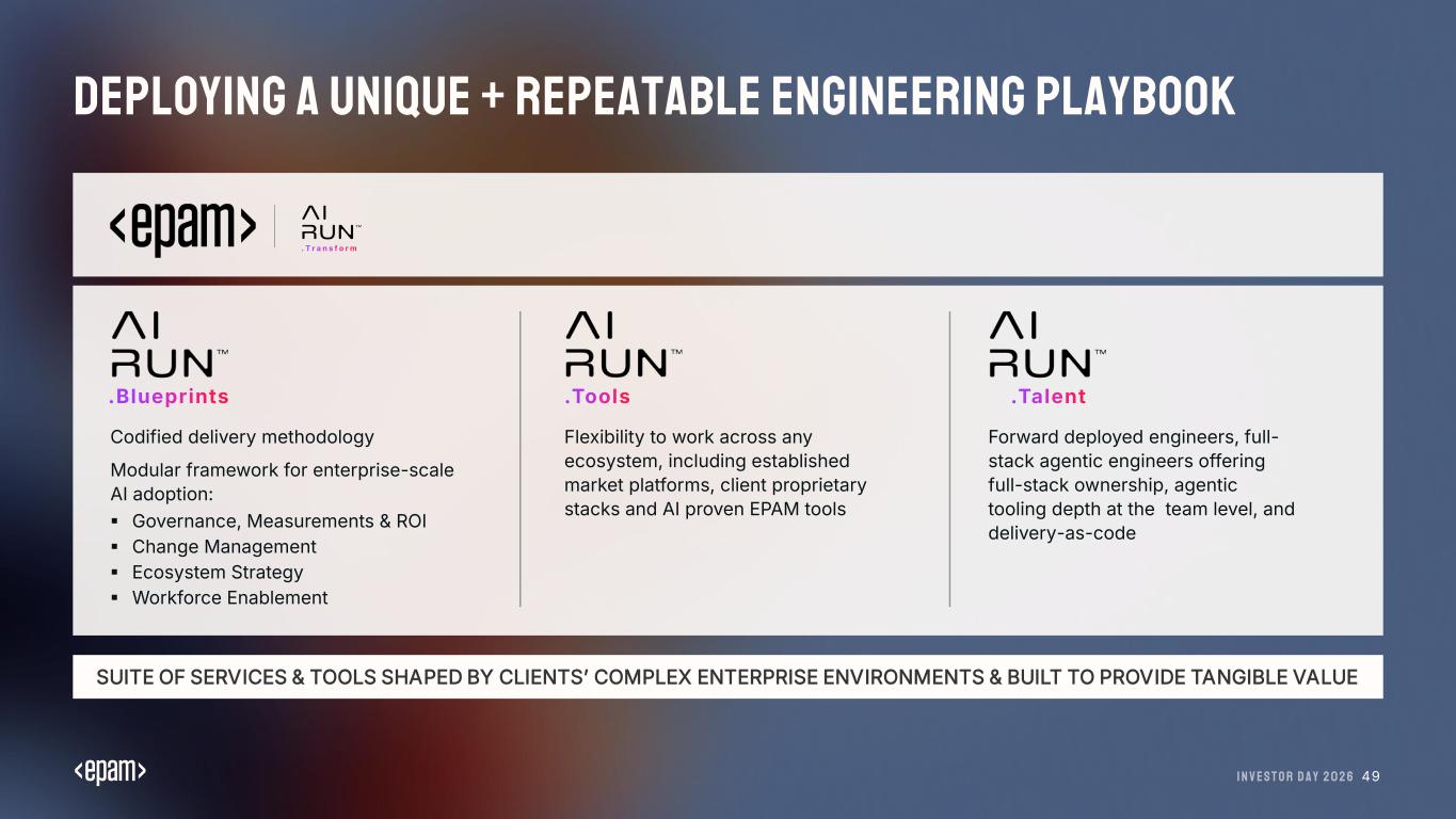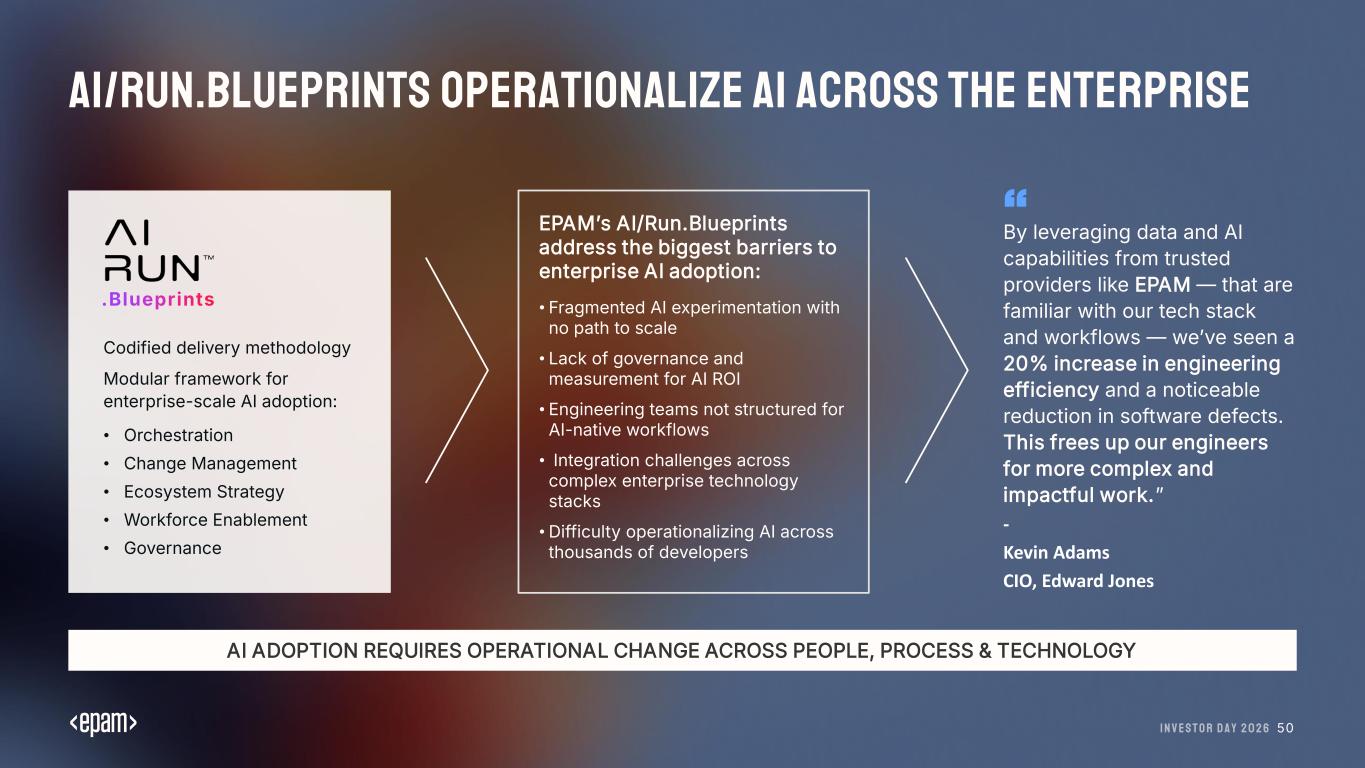AI/Run.Blueprints Operationalize AI across the Enterprise Codified delivery methodology Modular framework for enterprise-scale AI adoption: • Orchestration • Change Management • Ecosystem Strategy • Workforce Enablement • Governance AI ADOPTION REQUIRES OPERATIONAL CHANGE ACROSS PEOPLE, PROCESS & TECHNOLOGY 50 EPAM’s AI/Run.Blueprints address the biggest barriers to enterprise AI adoption: • Fragmented AI experimentation with no path to scale • Lack of governance and measurement for AI ROI • Engineering teams not structured for AI-native workflows • Integration challenges across complex enterprise technology stacks • Difficulty operationalizing AI across thousands of developers .Bluepr ints By leveraging data and AI capabilities from trusted providers like EPAM — that are familiar with our tech stack and workflows — we’ve seen a 20% increase in engineering efficiency and a noticeable reduction in software defects. This frees up our engineers for more complex and impactful work.” - Kevin Adams CIO, Edward Jones “
