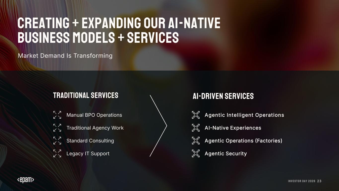 Traditional Services AI-Driven Services Market Demand Is Transforming Creating + expanding our Ai-Native business models + services Agentic Intelligent Operations AI-Native Experiences Agentic Operations (Factories) Agentic Security Manual BPO Operations Legacy IT Support Traditional Agency Work Standard Consulting 23