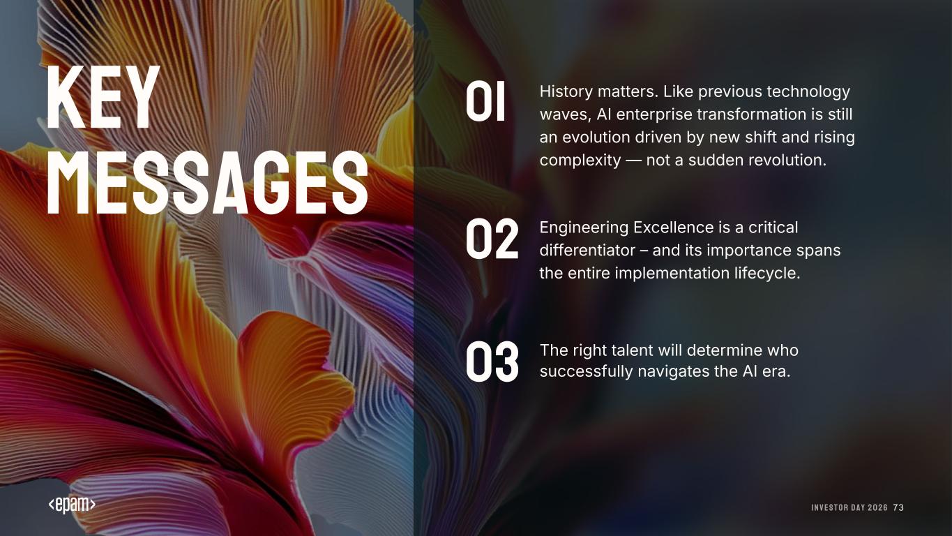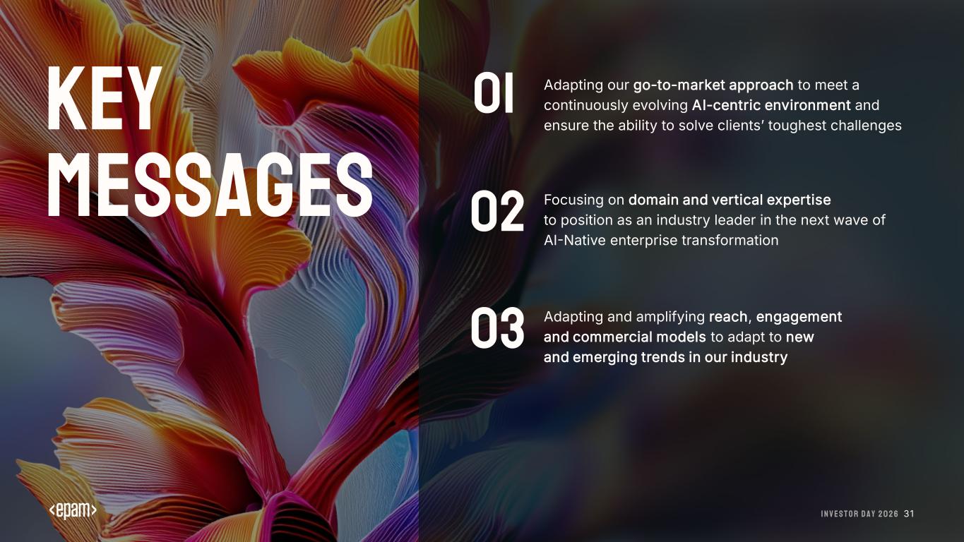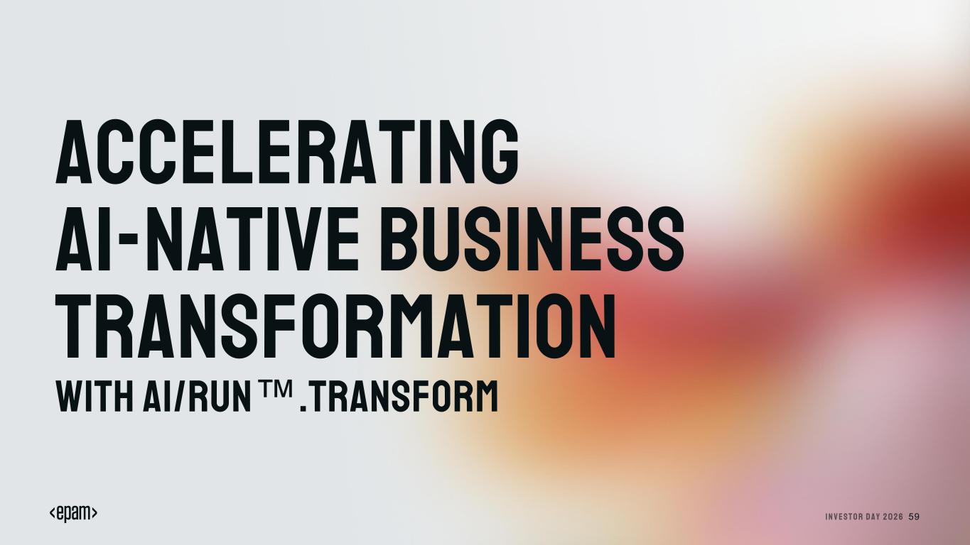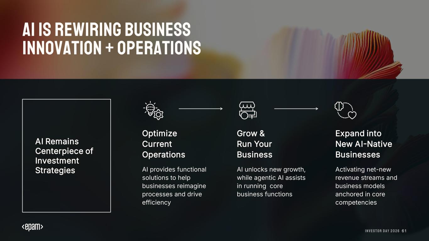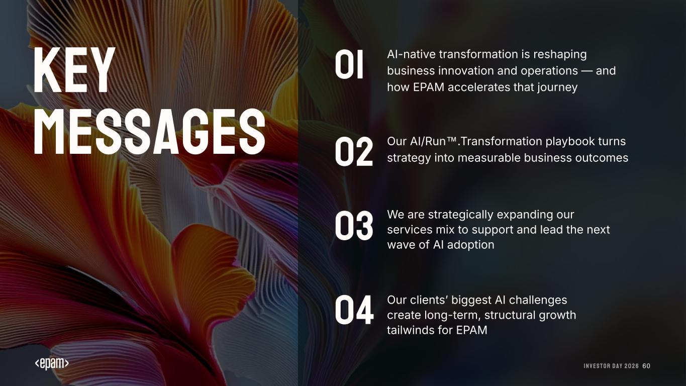 Key messages AI-native transformation is reshaping business innovation and operations — and how EPAM accelerates that journey 01 02 Our AI/Run .Transformation playbook turns strategy into measurable business outcomes 03 We are strategically expanding our services mix to support and lead the next wave of AI adoption 04 Our clients’ biggest AI challenges create long-term, structural growth tailwinds for EPAM 60
