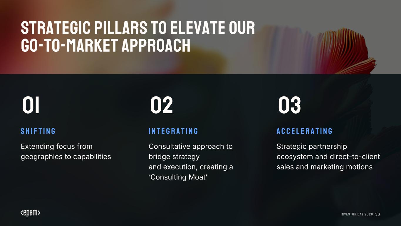 Strategic Pillars to Elevate OUR Go-to-Market Approach 01 S H I F T I N G Extending focus from geographies to capabilities 02 I N T E G R A T I N G Consultative approach to bridge strategy and execution, creating a ‘Consulting Moat’ 03 A C C E L E R A T I N G Strategic partnership ecosystem and direct-to-client sales and marketing motions 33