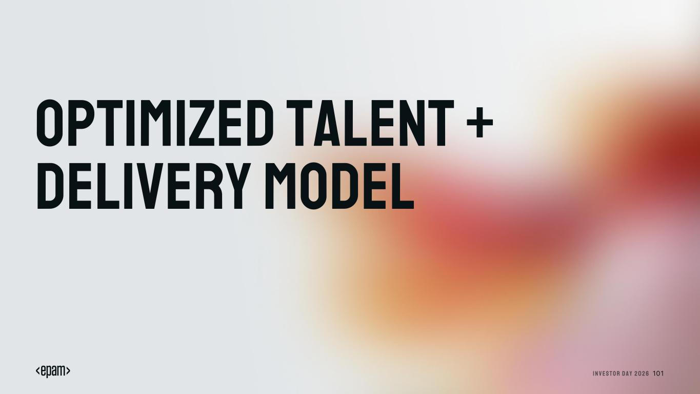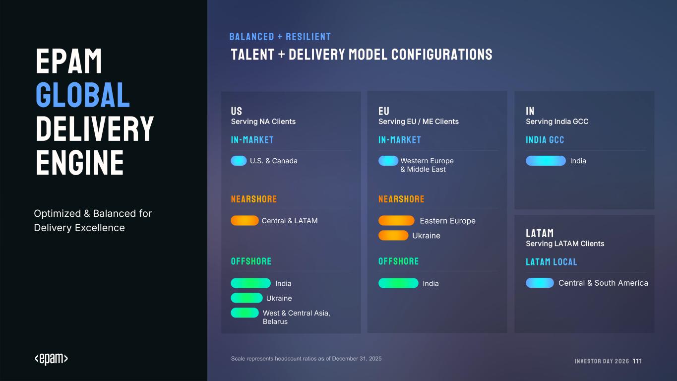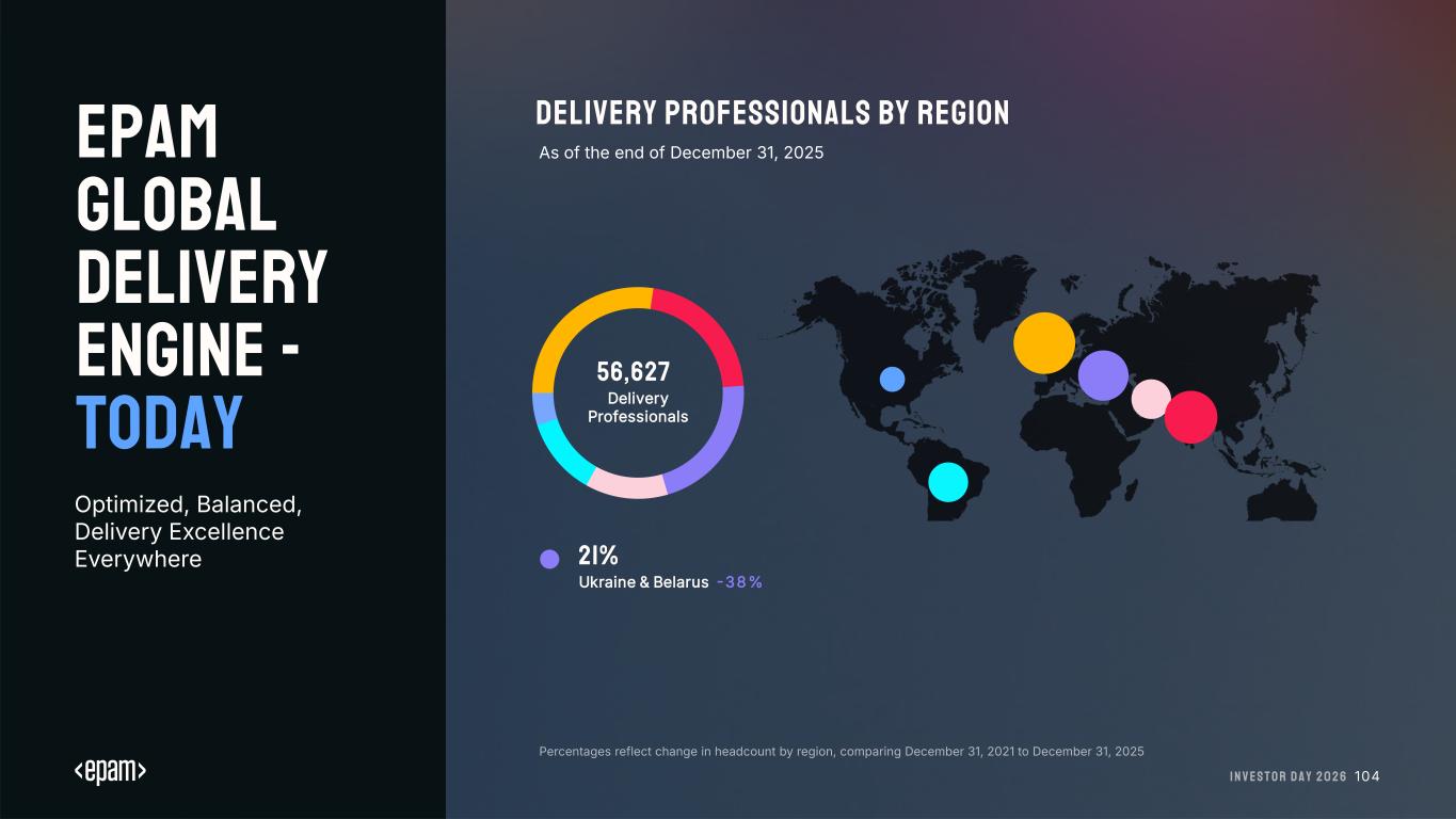 Delivery Professionals By Region As of the end of December 31, 2025EPAM Global Delivery ENGINE - TODAY Optimized, Balanced, Delivery Excellence Everywhere 21% Ukraine & Belarus -38% 56,627 Delivery Professionals 104