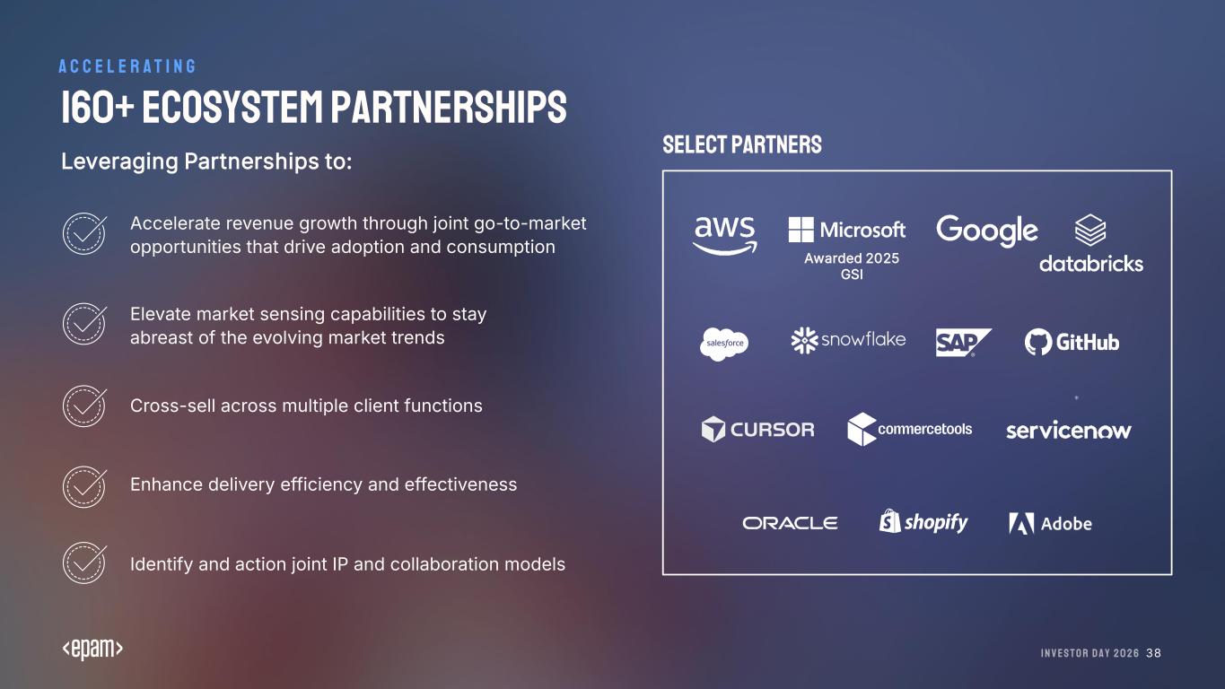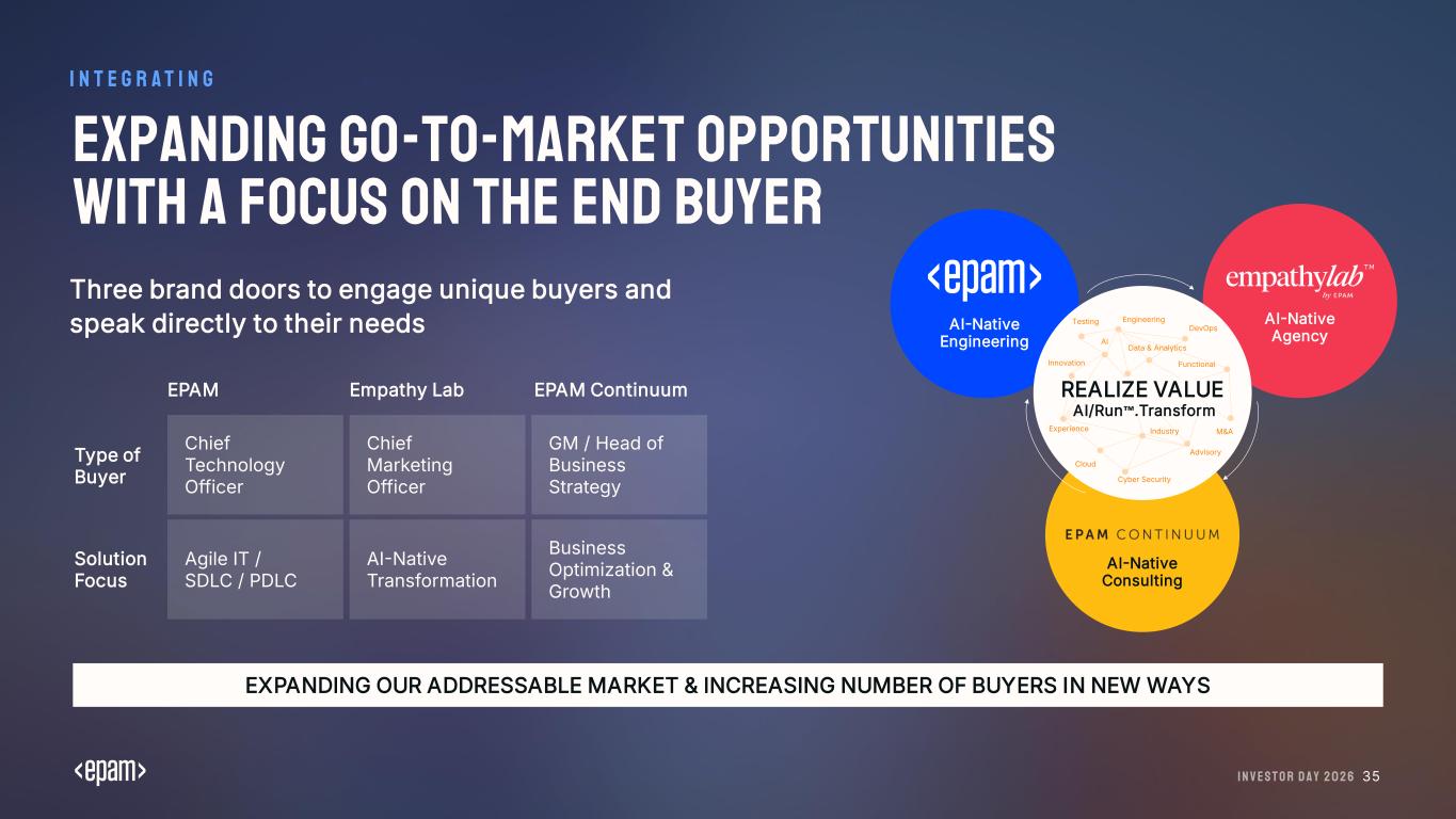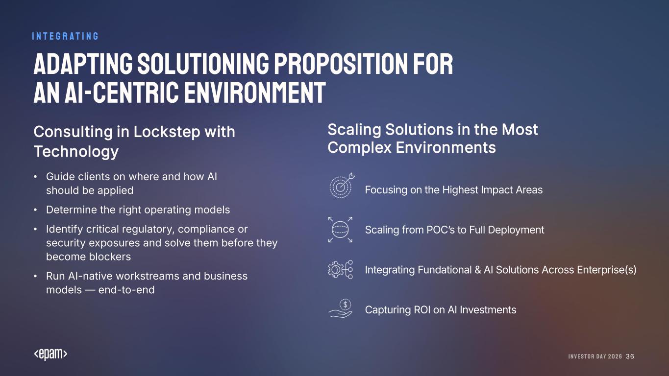 Expanding Go-to-Market Opportunities with a Focus On the End Buyer EXPANDING OUR ADDRESSABLE MARKET & INCREASING NUMBER OF BUYERS IN NEW WAYS Three brand doors to engage unique buyers and speak directly to their needs AI-Native Engineering AI-Native Consulting AI-Native Agency Cloud Cyber Security DevOps Engineering Advisory M&A Testing AI Experience Functional Data & Analytics Innovation Industry AI/Run .Transform REALIZE VALUE GM / Head of Business Strategy Business Optimization & Growth Chief Marketing Officer AI-Native Transformation Chief Technology Officer Agile IT / SDLC / PDLC EPAM Empathy Lab EPAM Continuum Type of Buyer Solution Focus I N T E G R A T I N G 35