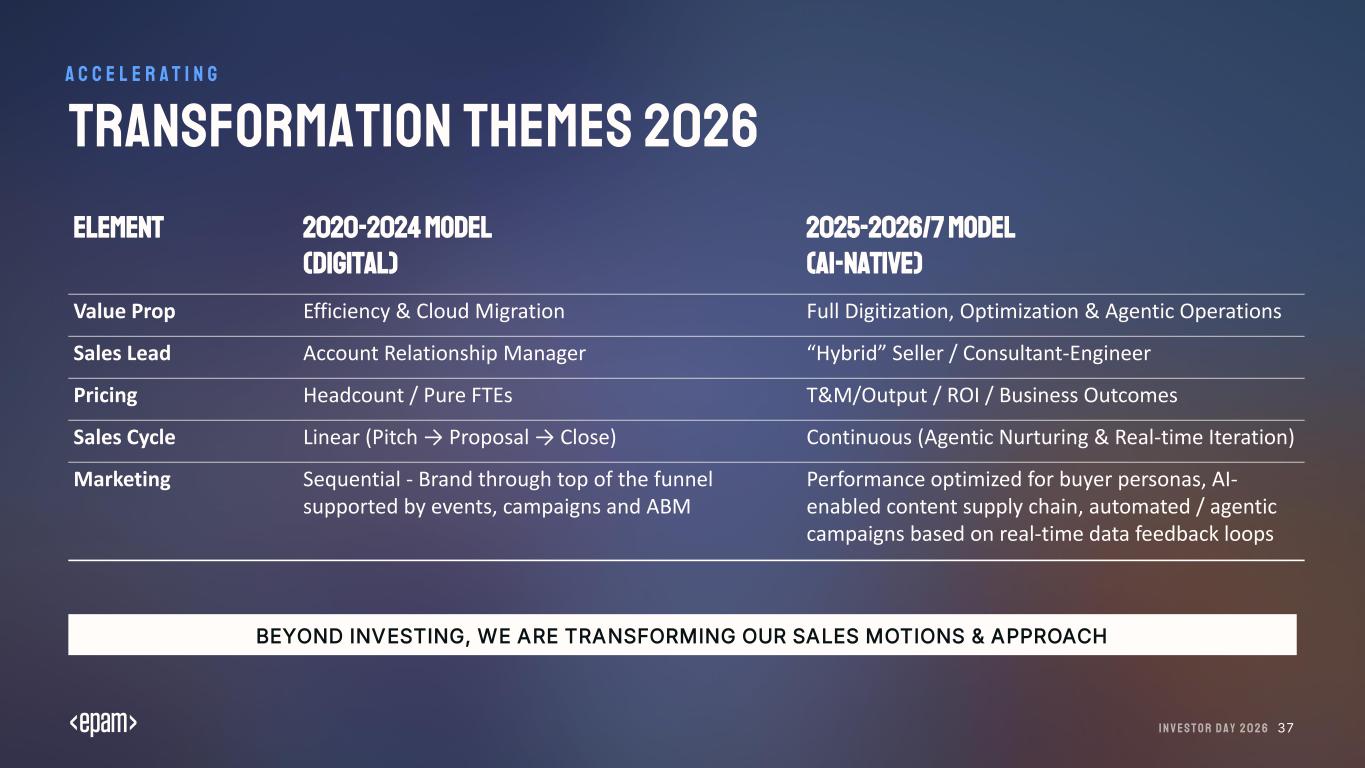 Transformation Themes 2026 ELEMENT 2020-2024 MODEL (DIGITAL) 2025-2026/7 MODEL (AI-NATIVE) Value Prop Efficiency & Cloud Migration Full Digitization, Optimization & Agentic Operations Sales Lead Account Relationship Manager “Hybrid” Seller / Consultant-Engineer Pricing Headcount / Pure FTEs T&M/Output / ROI / Business Outcomes Sales Cycle Linear (Pitch → Proposal → Close) Continuous (Agentic Nurturing & Real-time Iteration) Marketing Sequential - Brand through top of the funnel supported by events, campaigns and ABM Performance optimized for buyer personas, AI- enabled content supply chain, automated / agentic campaigns based on real-time data feedback loops A C C E L E R A T I N G BEYOND INVESTING, WE ARE TRANSFORMING OUR SALES MOTIONS & APPROACH 37
