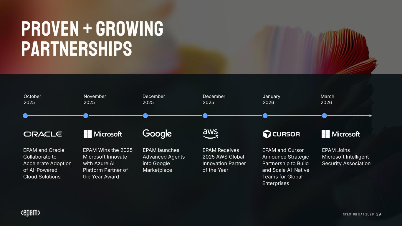 Proven + Growing Partnerships 39 EPAM Joins Microsoft Intelligent Security Association EPAM launches Advanced Agents into Google Marketplace EPAM Wins the 2025 Microsoft Innovate with Azure AI Platform Partner of the Year Award EPAM Receives 2025 AWS Global Innovation Partner of the Year EPAM and Oracle Collaborate to Accelerate Adoption of AI-Powered Cloud Solutions EPAM and Cursor Announce Strategic Partnership to Build and Scale AI-Native Teams for Global Enterprises October 2025 November 2025 December 2025 December 2025 January 2026 March 2026